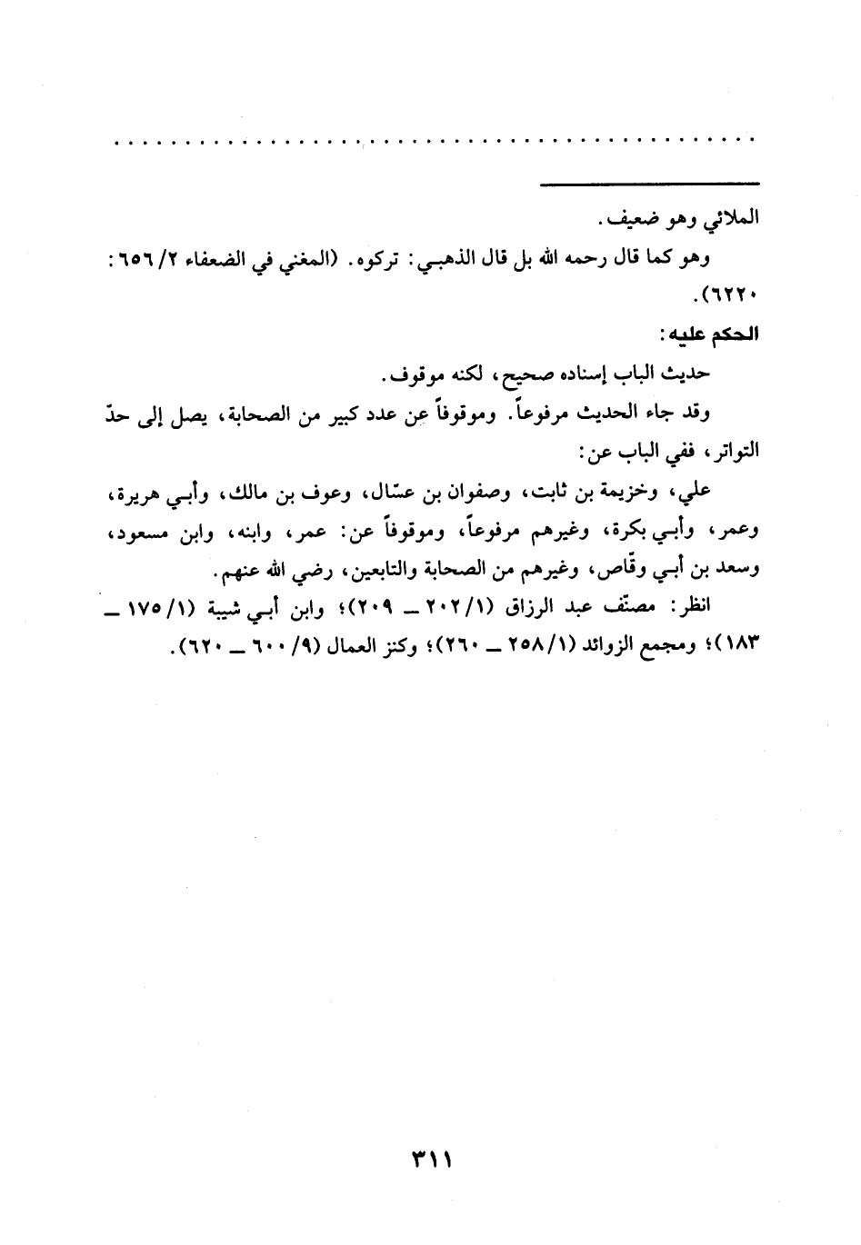 علي، وخزيمة بن ثابت، وصفوان بن عسال، وعوف بن مالك، وأبي هريرة، وعمر، وأبي بكرة، وغيرهم مرفوعًا، وموقوفًا عن: عمر، وابنه، وابن مسعود، وسعد بن أبي وقّاص، وغيرهم من الصحابة والتابعين، رضي الله عنهم. انظر: مصنف عبد الرزاق (1/ 202 - 209)؛ وابن أبي شيبة (1/ 175 - 183)؛ ومجمع الزوائد (1/ 258 - 260)؛ وكنز العمال (9/ 600 - 620).