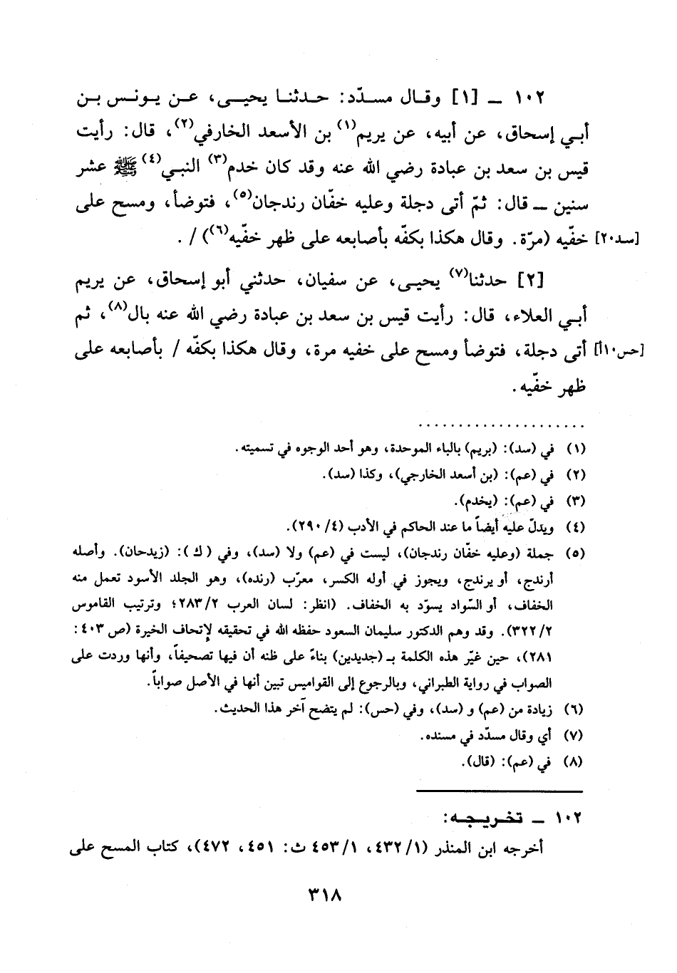 [2] حَدَّثَنَا يَحْيَى، عَنْ سُفْيَانَ، حَدَّثَنِي أَبُو إِسْحَاقَ، عَنْ يَرِيمَ أَبِي الْعَلَاءِ، قَالَ: رَأَيْتُ قَيْسَ بْنَ سَعْدِ بْنِ عُبَادَةَ رَضِيَ اللهُ عَنْهُ بَالَ، ثُمَّ أُتَى دِجْلَةَ، §فَتَوَضَّأَ وَمَسَحَ عَلَى خُفَّيْهِ مَرَّةً، وَقَالَ هَكَذَا بِكَفِّهِ / بِأَصَابِعِهِ عَلَى ظَهْرِ خُفَّيْهِ