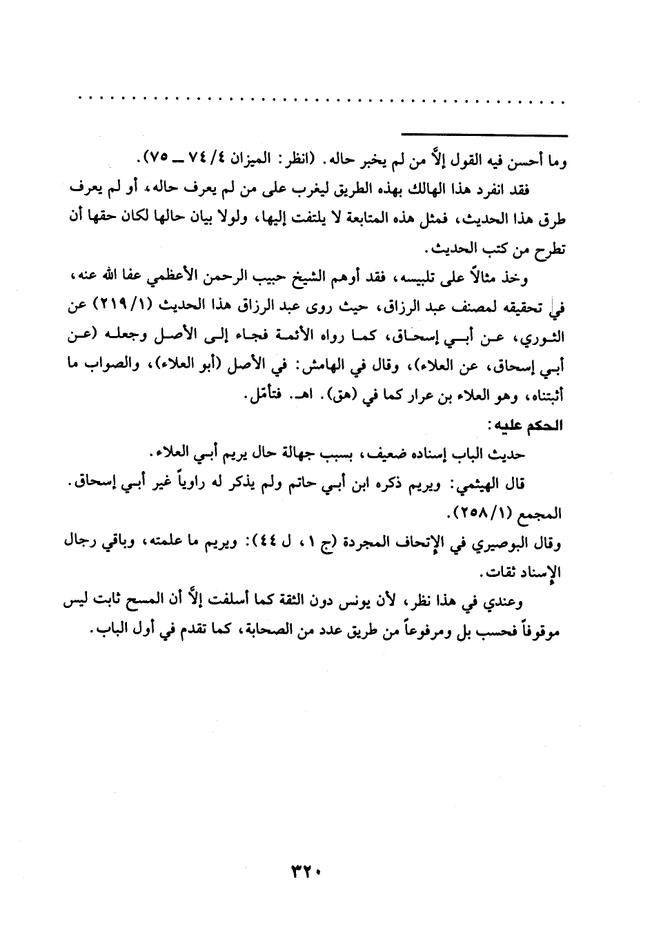 وخذ مثالًا على تلبيسه، فقد أوهم الشيخ حبيب الرحمن الأعظمي عفا الله عنه، في تحقيقه لمصنف عبد الرزاق، حيث روى عبد الرزاق هذا الحديث (1/ 219) عن الثوري، عن أبي إسحاق، كما رواه الأئمة فجاء إلى الأصل وجعله (عن أبي إسحاق، عن العلاء)، وقال في الهامش: في الأصل (أبو العلاء)، والصواب ما أثبتناه، وهو العلاء بن عرار كما في (هق). اهـ. فتأمّل.