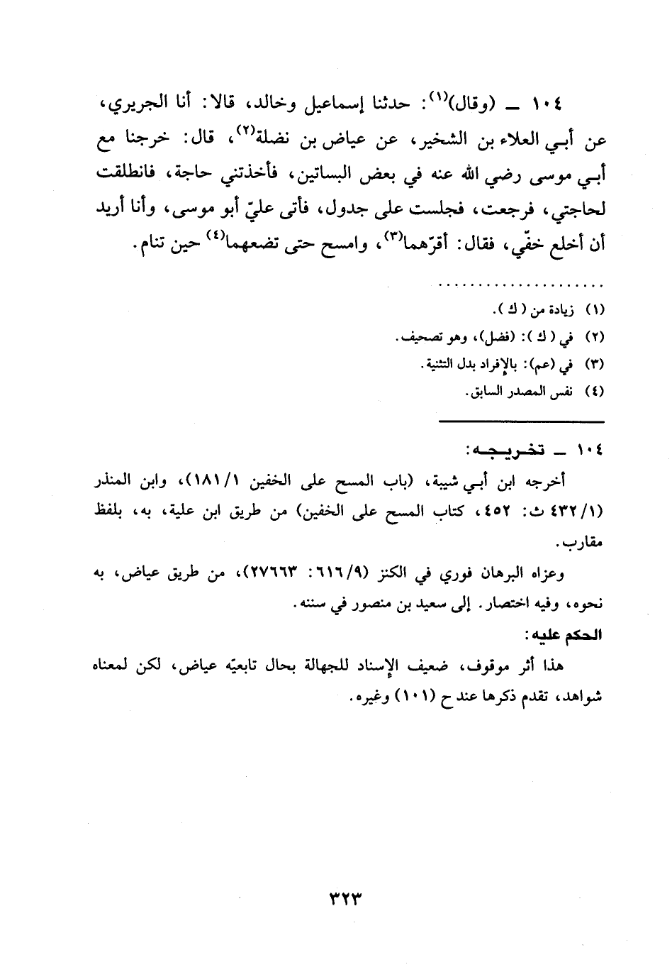 حَدَّثَنَا إِسْمَاعِيلُ وخَالِدٌ، قَالَا: أنا الْجُرَيْرِيُّ، عَنْ أَبِي الْعَلَاءِ بْنِ الشِّخِّيرِ، عَنْ عِيَاضِ بْنِ نَضْلَةَ، قَالَ: خَرَجْنَا مَعَ أَبِي مُوسَى رَضِيَ اللهُ عَنْهُ فِي بَعْضِ الْبَسَاتِينِ، فَأَخَذَتْنِي حَاجَةٌ، فَانْطَلَقْتُ لِحَاجَتِي، فَرَجَعْتُ، فَجَلَسْتُ عَلَى جَدْولٍ، فَأَتَى عَلَيَّ أَبُو مُوسَى، وَأَنَا أُرِيدُ أَنْ §أَخْلَعَ خُفَّيَّ، فَقَالَ: أَقِرَّهُمَا، وَامْسَحْ حَتَّى تَضَعَهُمَا حِينَ تَنَامُ