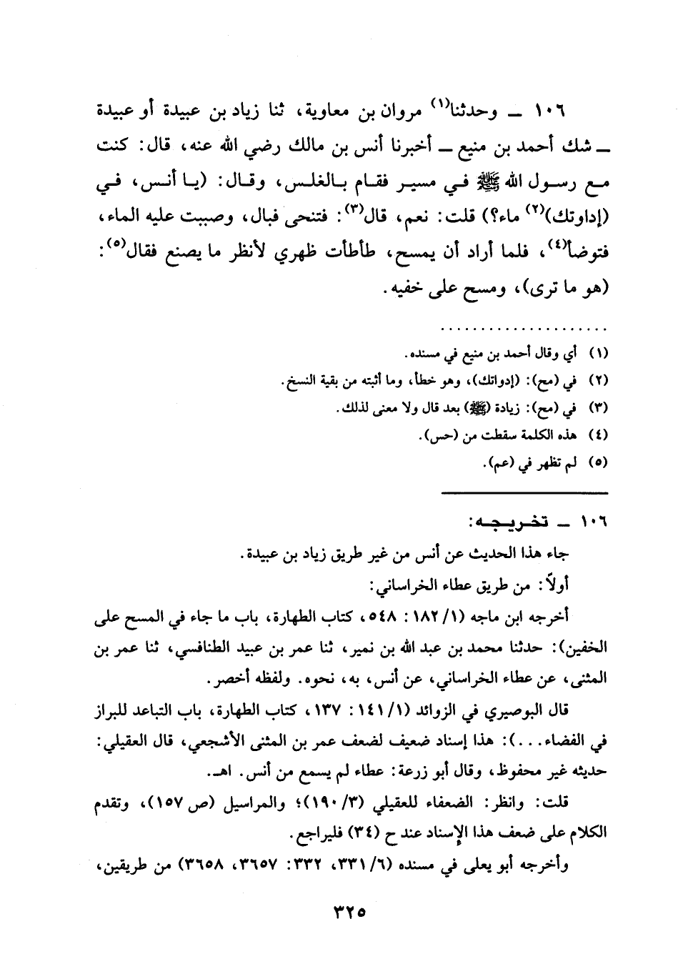 106 - وحَدَّثَنَا مَرْوَانُ بْنُ مُعَاوِيَةَ، ثنا زِيَادُ بنُ عُبَيْدَةَ أَوْ عُبَيْدَةُ - شَكَّ أَحْمَدُ بْنُ مَنِيعٍ - أَخْبَرَنَا أَنَسُ بن مالك ضي اللهُ عَنْهُ، قَالَ: كُنْتُ مَعَ رَسُولِ اللَّهِ صَلَّى اللَّهُ عَلَيْهِ وَسَلَّمَ فِي مَسِيرٍ فَقَامَ بِالْغَلَسِ، وَقَالَ: (يَا أَنَسُ، فِي (إِدَاوَتِكَ) مَاءٌ؟) قُلْتُ: نَعَمْ، قَالَ: فَتَنَحَّى فَبَالَ، وَصَبَبْتُ عَلَيْهِ الْمَاءَ، فَتَوَضَّأَ، فَلَمَّا أَرَادَ أَنْ يَمْسَحَ، طَأْطَأْتُ ظَهْرِي لَأَنْظُرَ مَا يَصْنَعُ فَقَالَ: (§هُوَ مَا تَرَى) ، وَمَسَحَ عَلَى خُفَّيْهِ