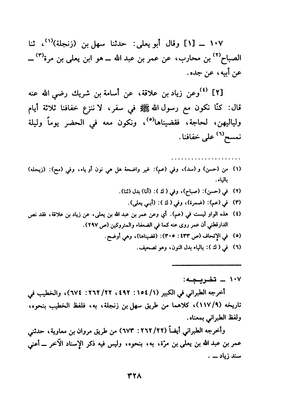 حَدَّثَنَا سَهْلُ بْنُ (زَنْجَلَةَ) ، ثنا الصَّبَّاحُ بْنُ مُحَارِبٍ، عَنْ عُمَرَ بْنِ عَبْدِ اللَّهِ - هُوَ ابْنُ يَعْلَى بْنِ مُرَّةَ - عَنْ أَبِيهِ، عَنْ جَدِّهِ [2] وعَنْ زِيَادِ بْنِ عِلَاقَةَ، عَنْ أُسَامَةَ بْنِ شَرِيكٍ رَضِيَ اللهُ عَنْهُ قَالَ: كُنَّا نَكُونُ مَعَ رَسُولِ اللَّهِ صَلَّى اللَّهُ عَلَيْهِ وَسَلَّمَ §فِي سَفَرٍ، ولا نَنْزِعُ خِفَافَنَا ثَلَاثَةَ أَيَّامٍ وَلَيَالِيَهُنَّ، لِحَاجَةٍ، فَقَضَيْنَاهَا، وَنَكُونُ مَعَهُ فِي الْحَضَرِ يَوْمًا وَلَيْلَةً نَمْسَحُ عَلَى خِفَافِنَا