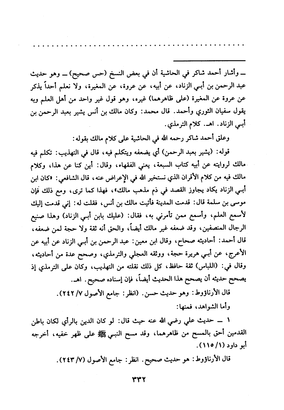 = -وأشار أحمد شاكر في الحاشية أن في بعض النسخ (حس صحيح) - وهو حديث عبد الرحمن بن أَبِي الزِّنَادِ، عَنْ أَبِيهِ، عَنْ عُرْوَةَ، عَنِ المغيرة، ولا نعلم أحدًا يذكر عن عروة عن المغيرة (على ظاهرهما) غيره، وهو قول غير واحد من أهل العلم وبه يقول سفيان الثوري وأحمد. قال محمد: وكان مالك بن أنس يشير بعبد الرحمن بن أبي الزناد. اهـ. كلام الترمذي.