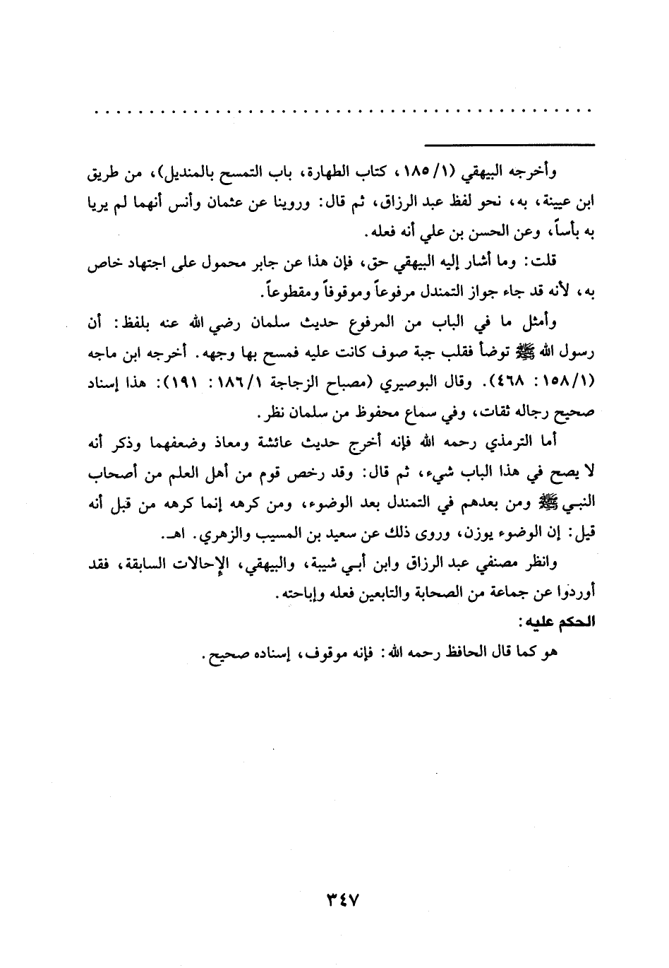 قلت: وما أشار إليه البيهقي حق، فإن هذا عن جابر محمول على اجتهاد خاص به، لأنه قد جاء جواز التمندل مرفوعًا وموقوفًا ومقطوعًا.