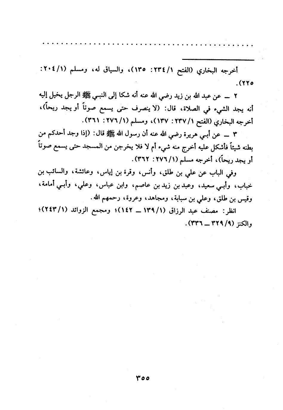 2 - عن عبد الله بن زيد رضي الله عنه أنه شكا إلى النبي - صلى الله عليه وسلم - الرجل يخيل إليه أنه يجد الشيء في الصلاة، قال: (لا ينصرف حتى يسمع صوتًا أويجد ريحًا)، أخرجه البخاري (الفتح 1/ 237: 137)، ومسلم (1/ 276: 361).