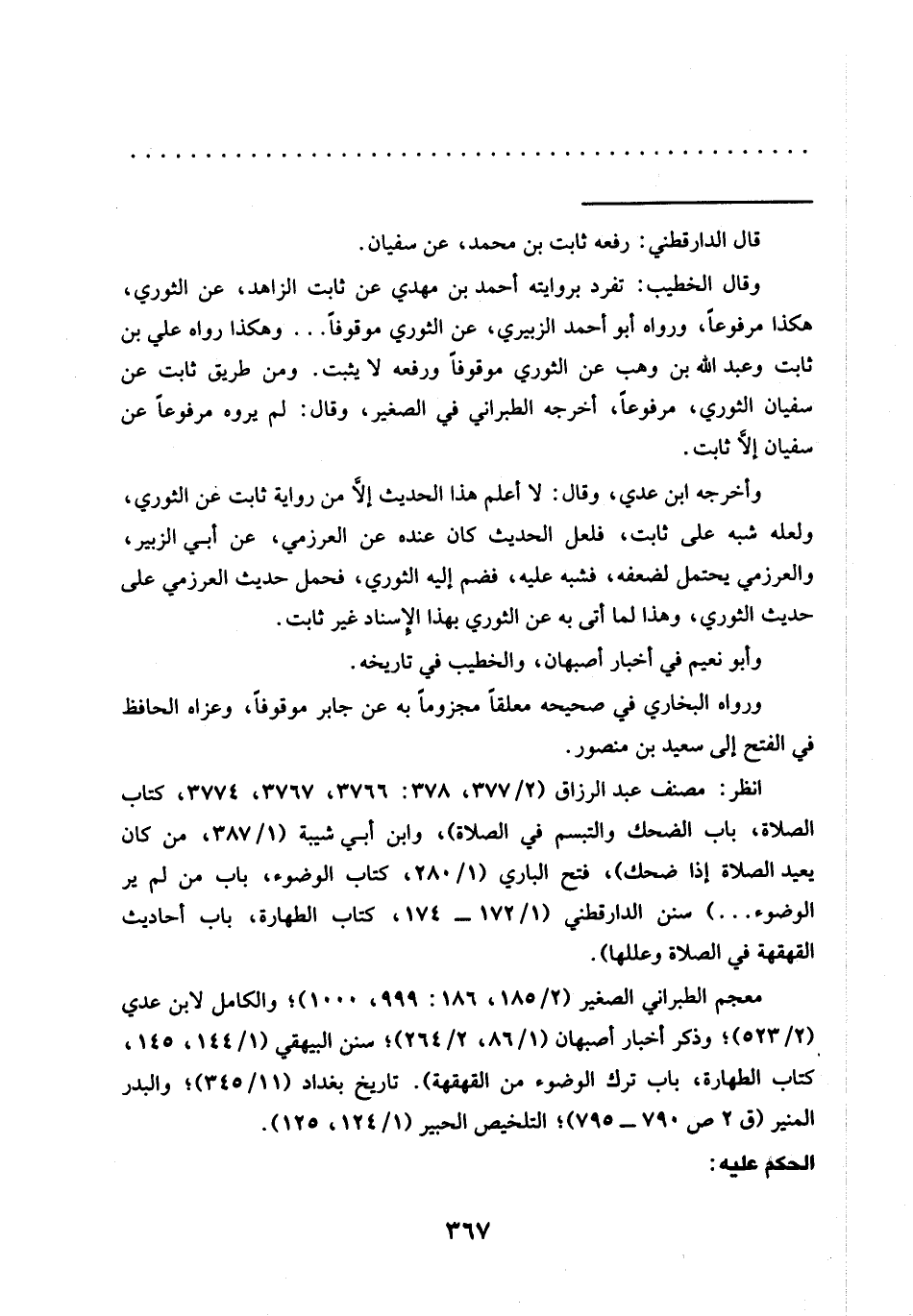 وقال الخطيب: تفرد بروايته أحمد بن مهدي عن ثابت الزاهد، عن الثوري، هكذا مرفوعًا، ورواه أبو أحمد الزبيري، عن الثوري موقوفًا ... وهكذا رواه علي بن ثابت وعبد الله بن وهب عن الثوري موقوفًا ورفعه لا يثبت. ومن طريق ثابت عن سفيان الثوري، مرفوعًا، أخرجه الطبراني في الصغير، وقال: لم يروه مرفوعًا عن سفيان إلَّا ثابت.