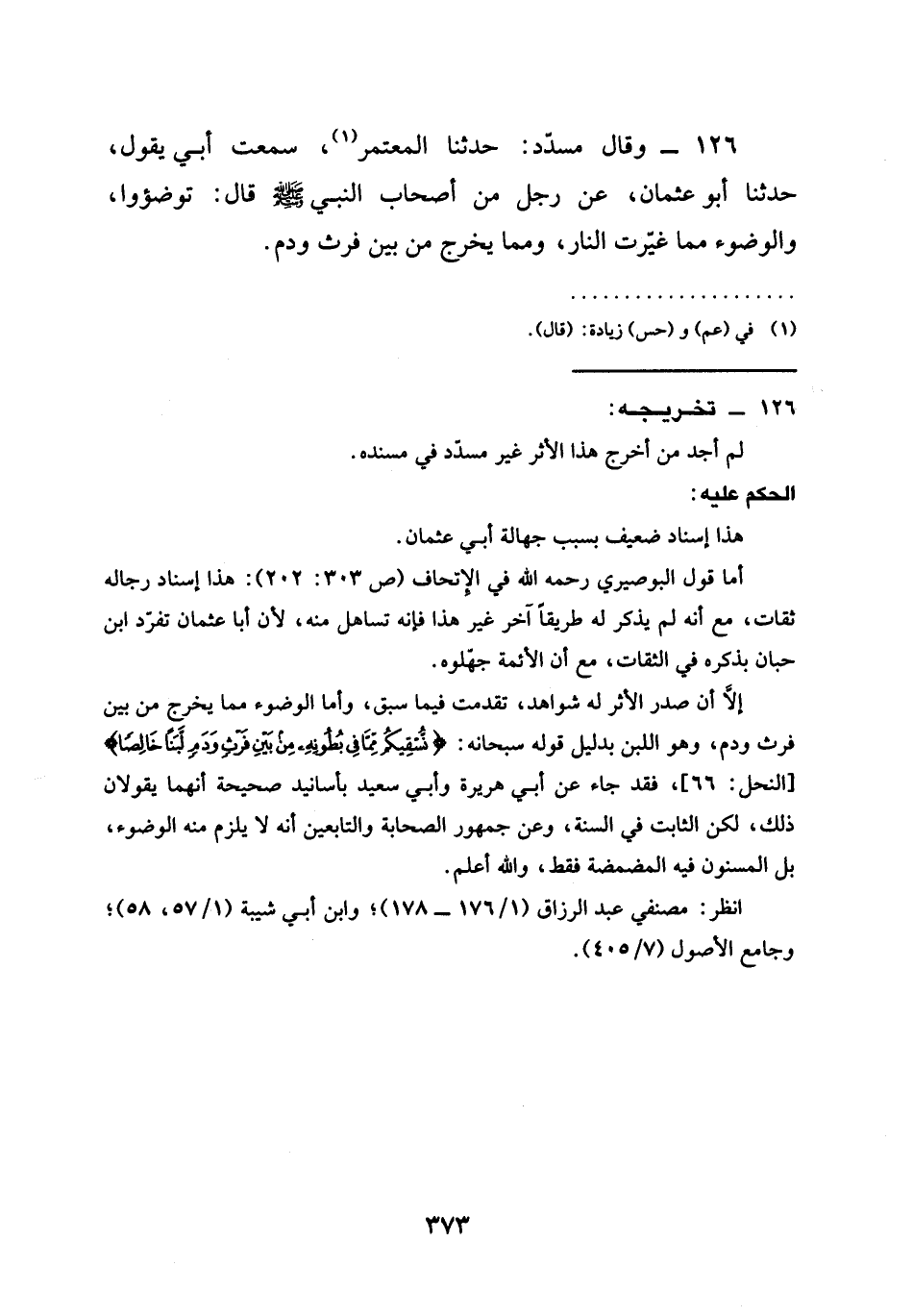 حَدَّثَنَا الْمُعْتَمِرُ، سَمِعْتُ أَبِي يَقُولُ، حَدَّثَنَا أَبُو عُثْمَانَ، عَنْ رَجُلٍ مِنْ أَصْحَابِ النَّبِيِّ صَلَّى اللَّهُ عَلَيْهِ وَسَلَّمَ قَالَ §توضؤوا، والوضوء مِمَّا غَيَّرَتِ النَّارُ، وَمِمَّا يَخْرُجُ مِنْ بَيْنِ فَرْثٍ وَدَمٍ