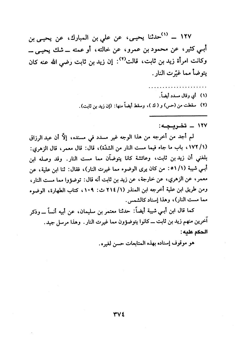 127 - حَدَّثَنَا يَحْيَى، عَنْ عَلِيِّ بْنِ الْمُبَارَكِ، عَنْ يَحْيَى بْنِ أَبِي كَثِيرٍ، عَنْ مَحْمُودِ بْنِ عَمْرٍو، عَنْ خَالَتِهِ، أَوْ عَمَّتِهِ - شَكَّ يَحْيَى - وَكَانَتِ امْرَأَةَ زَيْدِ بْنِ ثَابِتٍ، قَالَتْ: إِنَّ زَيْدَ بْنَ ثَابِتٍ رَضِيَ اللهُ عَنْهُ كَانَ §يَتَوَضَّأُ مِمَّا غَيَّرَتِ النَّارُ