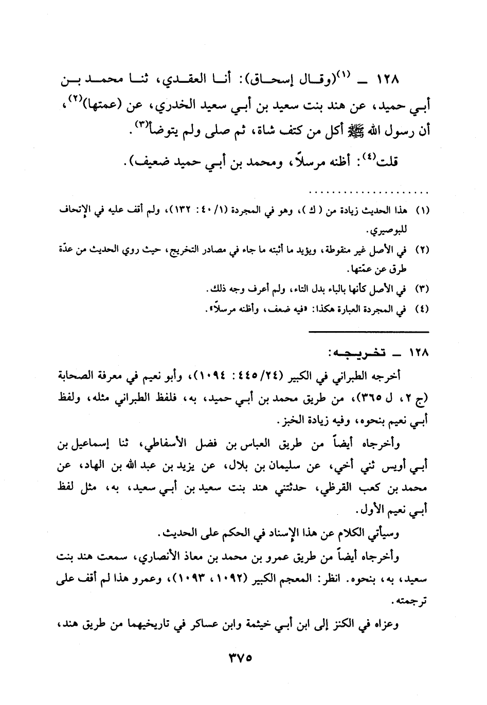 128 - (وَقَالَ إِسْحَاقُ) : أنا الْعَقَدِيُّ، ثنا مُحَمَّدُ بْنُ أَبِي حُمَيْدٍ، عَنْ هِنْدِ بِنْتِ سَعِيدِ بْنِ أَبِي سَعِيدٍ الْخُدْرِيِّ، عَنْ (عَمَّتِهَا) ، أَنَّ رَسُولَ اللَّهِ صَلَّى اللَّهُ عَلَيْهِ وَسَلَّمَ §أَكَلَ مِنْ كَتِفِ شَاةٍ، ثُمَّ صَلَّى وَلَمْ يَتَوَضَّأْ