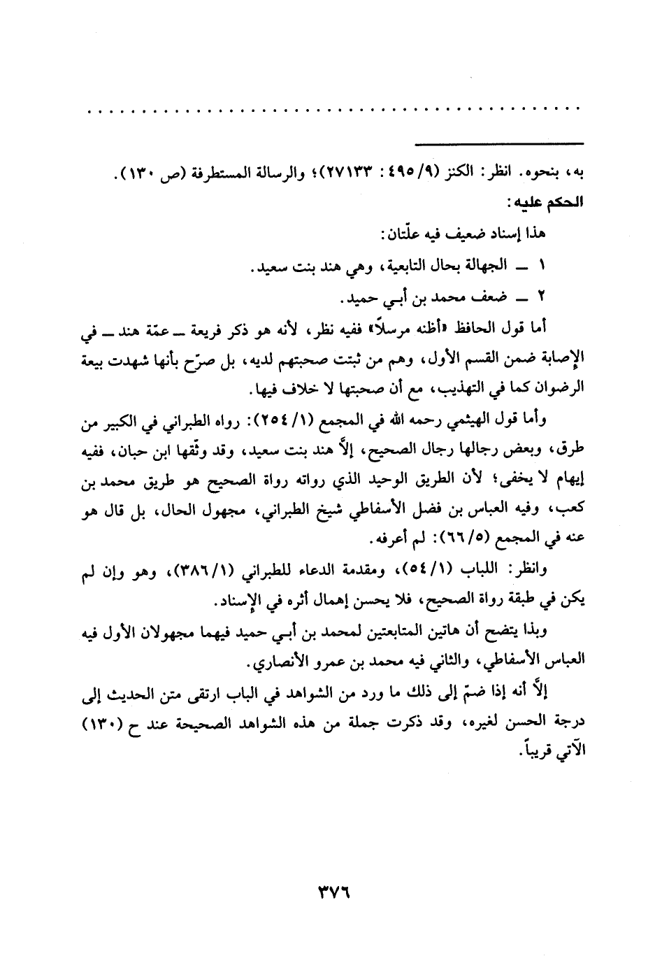 إلَّا أنه إذا ضمّ إلى ذلك ما ورد من الشواهد في الباب ارتقى متن الحديث إلى درجة الحسن لغيره، وقد ذكرت جملة من هذه الشواهد الصحيحة عند ح (130) الآتي قريبًا.