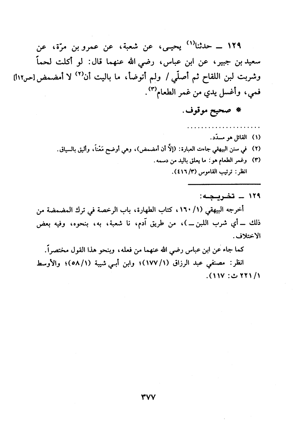 129 - حَدَّثَنَا يَحْيَى، عَنْ شُعْبَةَ، عَنْ عَمْرِو بْنِ مُرَّةَ، عَنْ سَعِيدِ بْنِ جُبَيْرٍ، عَنِ ابْنِ عَبَّاسٍ، رَضِيَ اللهُ عَنْهُمَا قَالَ: §لَوْ أَكَلْتُ لَحْمًا وَشَرِبْتُ لَبَنَ اللِّقَاحِ ثُمَّ أُصَلِّي / وَلَمْ أَتَوَضَّأْ، مَا بَالَيْتُ أَنْ لَا أُمَضْمِضَ فَمِي، وَأَغْسِلَ يَدِي مِنْ غَمْرِ الطَّعَامِ