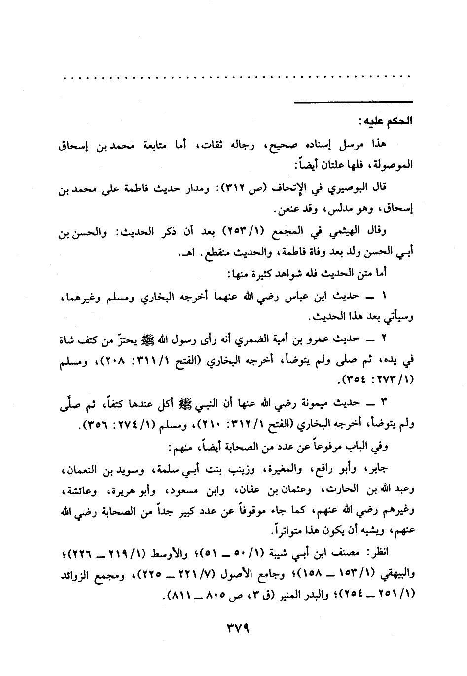 2 - حديث عمرو بن أمية الضمري أَنَّهُ رَأَى رَسُولَ اللَّهِ - صَلَّى اللَّهُ عَلَيْهِ وسلم - يحتزّ من كتف شاة في يده، ثم صلى ولم يتوضأ، أخرجه البخاري (الفتح 1/ 311: 208)، ومسلم (1/ 273: 354).
