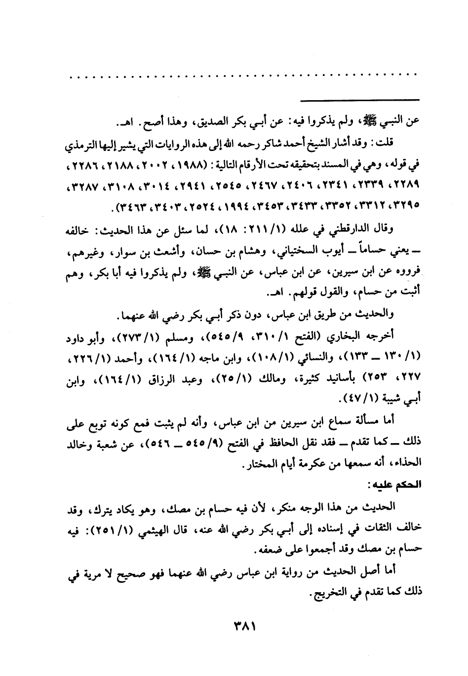 = عَنِ النَّبِيِّ - صَلَّى اللَّهُ عَلَيْهِ وَسَلَّمَ -، وَلَمْ يذكروا فيه: عن أبي بكر الصديق، وهذا أصح. اهـ. قلت: وقد أشار الشيخ أحمد شاكر رحمه الله إلى هذه الروايات التي يشير إليها الترمذي في قوله، وهي في المسند بتحقيقه تحت الأرقام التالية: (1988، 2002، 2188، 2286، 2289، 2339، 2341، 2406، 2467، 2545، 2941، 3014، 3108، 3287، 3295، 3312، 3352، 3433، 3453، 1994، 2524، 3403، 3463). وقال الدارقطني في علله (1/ 211: 18)، لما سئل عن هذا الحديث: خالفه -يعني حسامًا- أيوب السختياني، وهشام بن حسان، وأشعث بن سوار، وغيرهم، فرووه عن ابن سيرين، عَنِ ابْنِ عَبَّاسٍ، عَنِ النَّبِيِّ - صَلَّى اللَّهُ عليه وسلم -، ولم يذكروا فيه أبا بكر، وهم أثبت من حسام، والقول قولهم. اهـ.