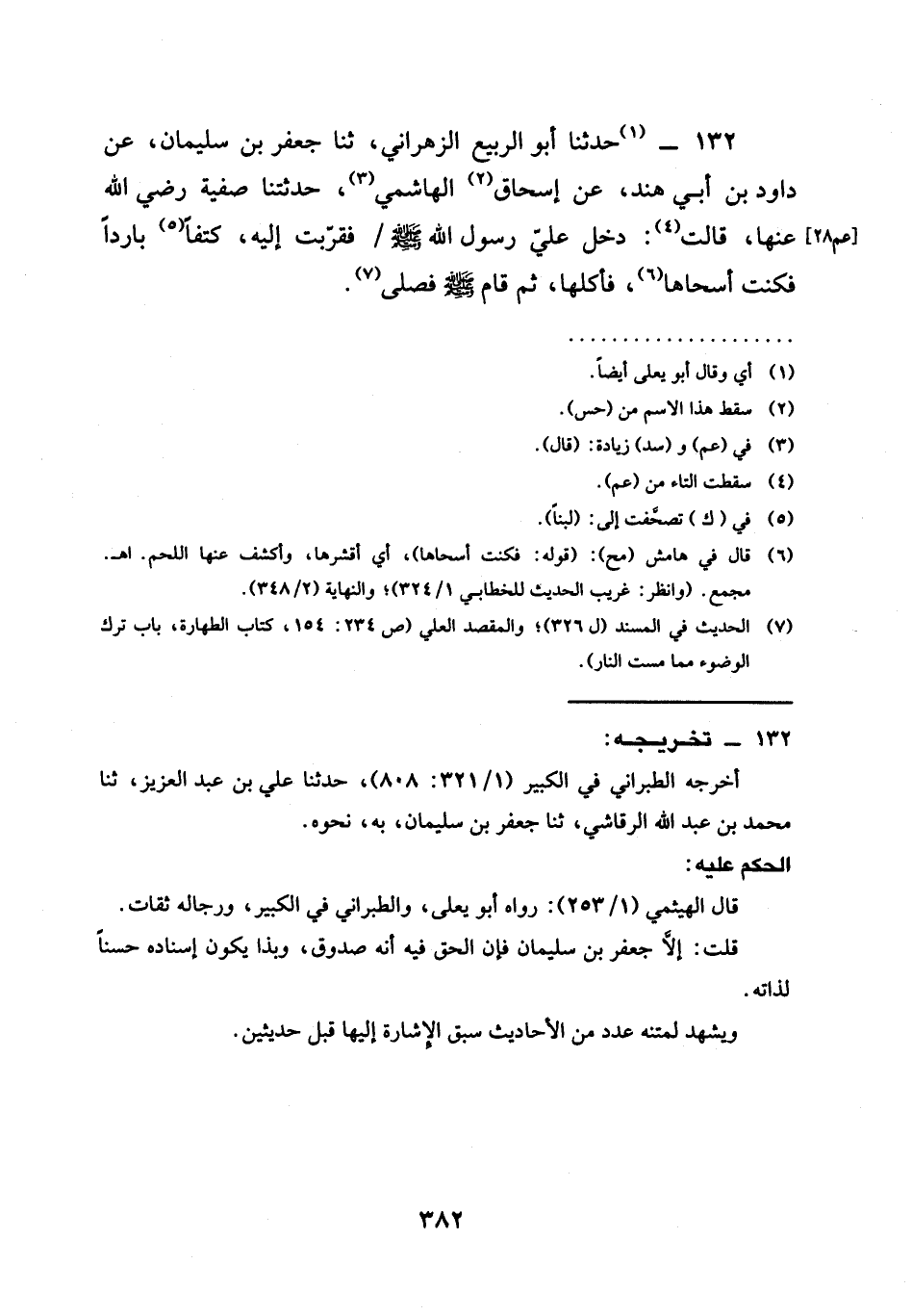 132 - حَدَّثَنَا أَبُو الرَّبِيعِ الزَّهْرَانِيُّ، ثنا جَعْفَرُ بْنُ سُلَيْمَانَ، عَنْ دَاوُدَ بْنِ أَبِي هِنْدَ، عَنْ إِسْحَاقَ الْهَاشِمِيِّ، حَدَّثَتْنَا صَفِيَّةَ رَضِيَ اللهُ عَنْهَا، قَالَتْ: دَخَلَ عَلَيَّ رَسُولُ اللَّهِ صَلَّى اللَّهُ عَلَيْهِ وَسَلَّمَ / فَقَرَّبَتْ إِلَيْهِ، كَتِفًا بَارِدًا فَكُنْتُ أَسْحَاهَا، §فَأَكَلَهَا، ثُمَّ قَامَ صَلَّى اللَّهُ عَلَيْهِ وَسَلَّمَ فَصَلَّى