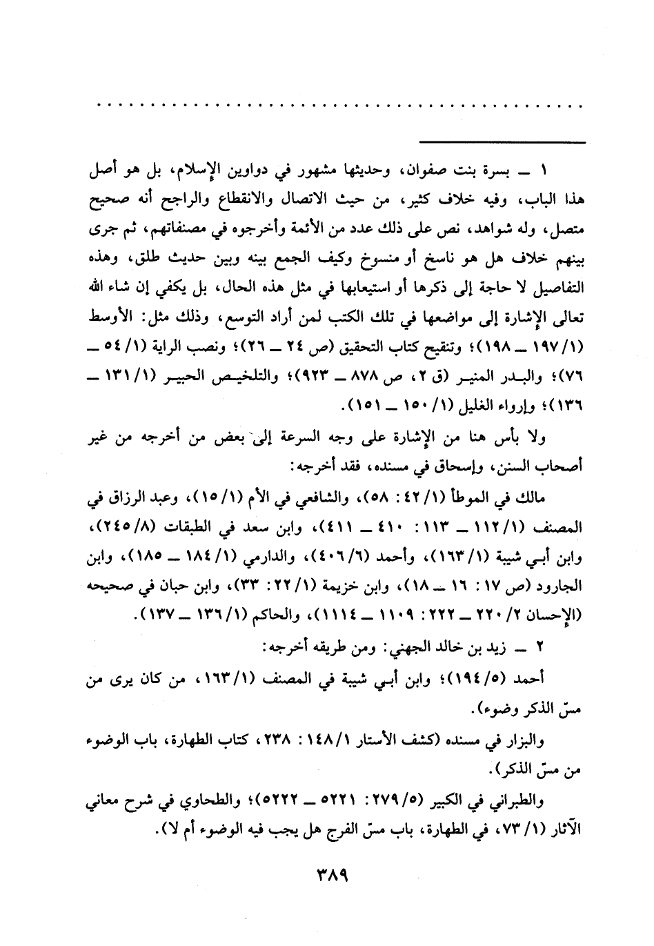 1 - بسرة بنت صفوان، وحديثها مشهور في دواوين الإسلام، بل هو أصل هذا الباب، وفيه خلاف كثير، من حيث الاتصال والانقطاع والراجح أنه صحيح متصل، وله شواهد، نص على ذلك عدد من الأئمة وأخرجوه في مصنفاتهم، ثم جرى بينهم خلاف هل هو ناسخ أو منسوخ وكيف الجمع بينه وبين حديث طلق، وهذه التفاصيل لا حاجة إلى ذكرها أو استيعابها في مثل هذه الحال، بل يكفي إن شاء الله تعالى الإشارة إلى مواضعها في تلك الكتب لمن أراد التوسع، وذلك مثل: الأوسط (1/ 197 - 198)؛ وتنقيح كتاب التحقيق (ص 24 - 26)؛ ونصب الراية (1/ 54 - 76)؛ والبدر المنير (ق 2، ص 878 - 923)؛ والتلخيص الحبير (1/ 131 - 136)؛ وإرواء الغليل (1/ 150 - 151).