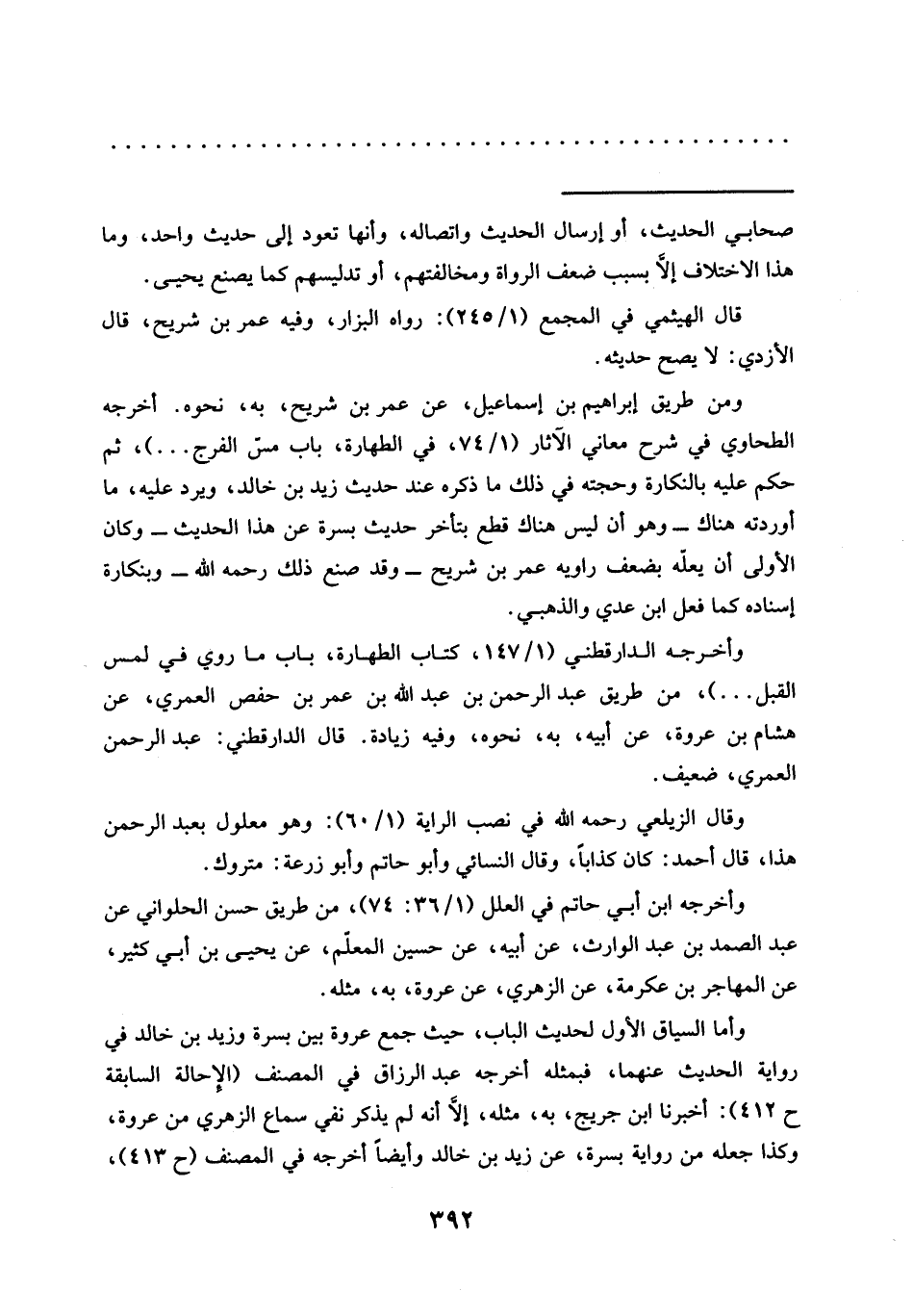 وأما السياق الأول لحديث الباب، حيث جمع عروة بين بسرة وزيد بن خالد في رواية الحديث عنهما، فبمثله أخرجه عبد الرزاق في المصنف (الإحالة السابقة ح 412): أخبرنا ابن جريج، به، مثله، إلَّا أنه لم يذكر نفي سماع الزهري من عروة، وكذا جعله من رواية بسرة، عن زيد بن خالد وأيضًا أخرجه في المصنف (ح 413)،=
