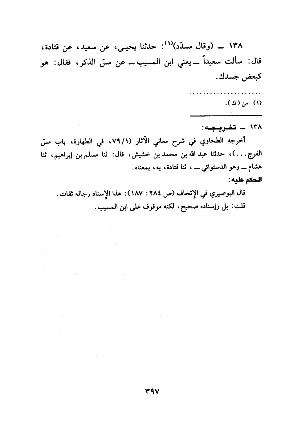 138 - (وَقَالَ مُسَدَّدٌ) (¬1): حَدَّثَنَا يَحْيَى، عَنْ سَعِيدٍ، عَنْ قَتَادَةَ، قَالَ: سَأَلْتُ سَعِيدًا -يَعْنِي ابْنَ الْمُسَيَّبِ- عَنْ مَسِّ الذَّكَرِ، فَقَالَ: هُوَ كَبَعْضِ جَسَدِكَ.
