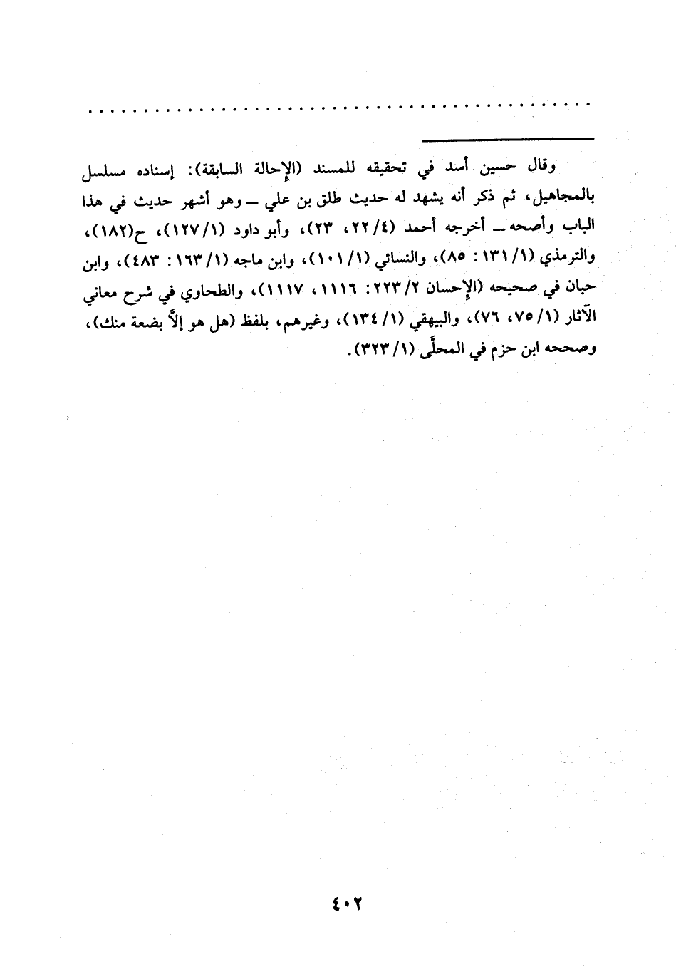 = وقال حسين أسد في تحقيقه للمسند (الإحالة السابقة): إسناده مسلسل بالمجاهيل، ثم ذكر أنه يشهد له حديث طلق بن علي -وهو أشهر حديث في هذا الباب وأصحه- أخرجه أحمد (4/ 22، 23)، وأبو داود (1/ 127)، ح (182)، والترمذي (1/ 131: 85)، والنسائي (1/ 101)، وابن ماجه (1/ 163: 483)، وابن حبان في صحيحه (الإحسان 2/ 223: 1116، 1117)، والطحاوي في شرح معاني الآثار (1/ 75، 76)، والبيهقي (1/ 134)، وغيرهم، بلفظ (هل هو إلَّا بضعة منك)، وصححه ابن حزم في المحلَّى (1/ 323).