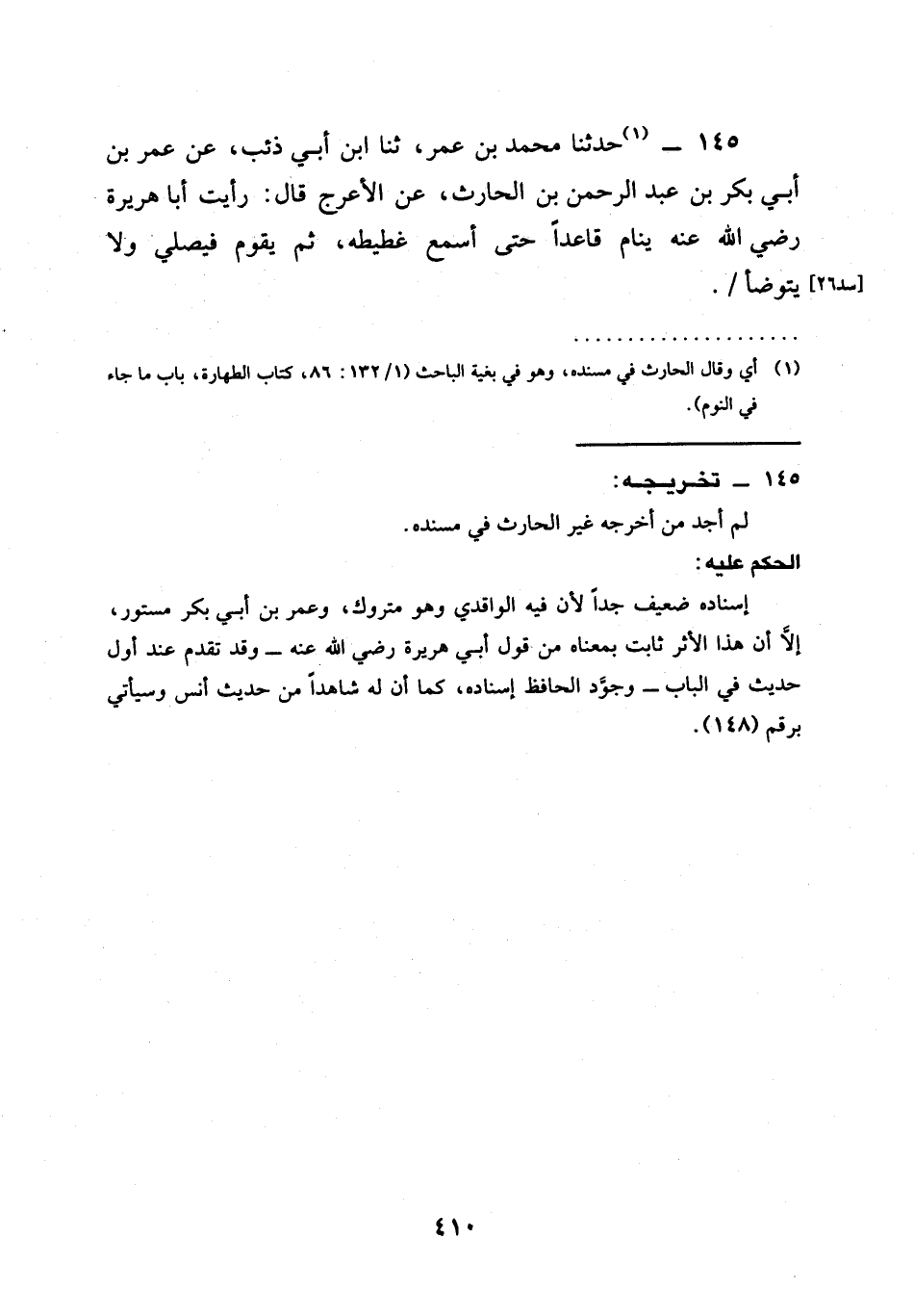 145 - حَدَّثَنَا مُحَمَّدُ بْنُ عُمَرَ، ثنا ابْنُ أَبِي ذِئْبٍ، عَنْ عُمَرَ بْنِ أَبِي بَكْرِ بْنِ عَبْدِ الرَّحْمَنِ بْنِ الْحَارِثِ، عَنِ الْأَعْرَجِ قَالَ: رَأَيْتُ أَبَا هُرَيْرَةَ رَضِيَ اللهُ عَنْهُ §يَنَامُ قَاعِدًا حَتَّى أَسْمَعَ غَطِيطَهُ، ثُمَّ يَقُومُ فَيُصَلِّي وَلَا يَتَوَضَّأُ /