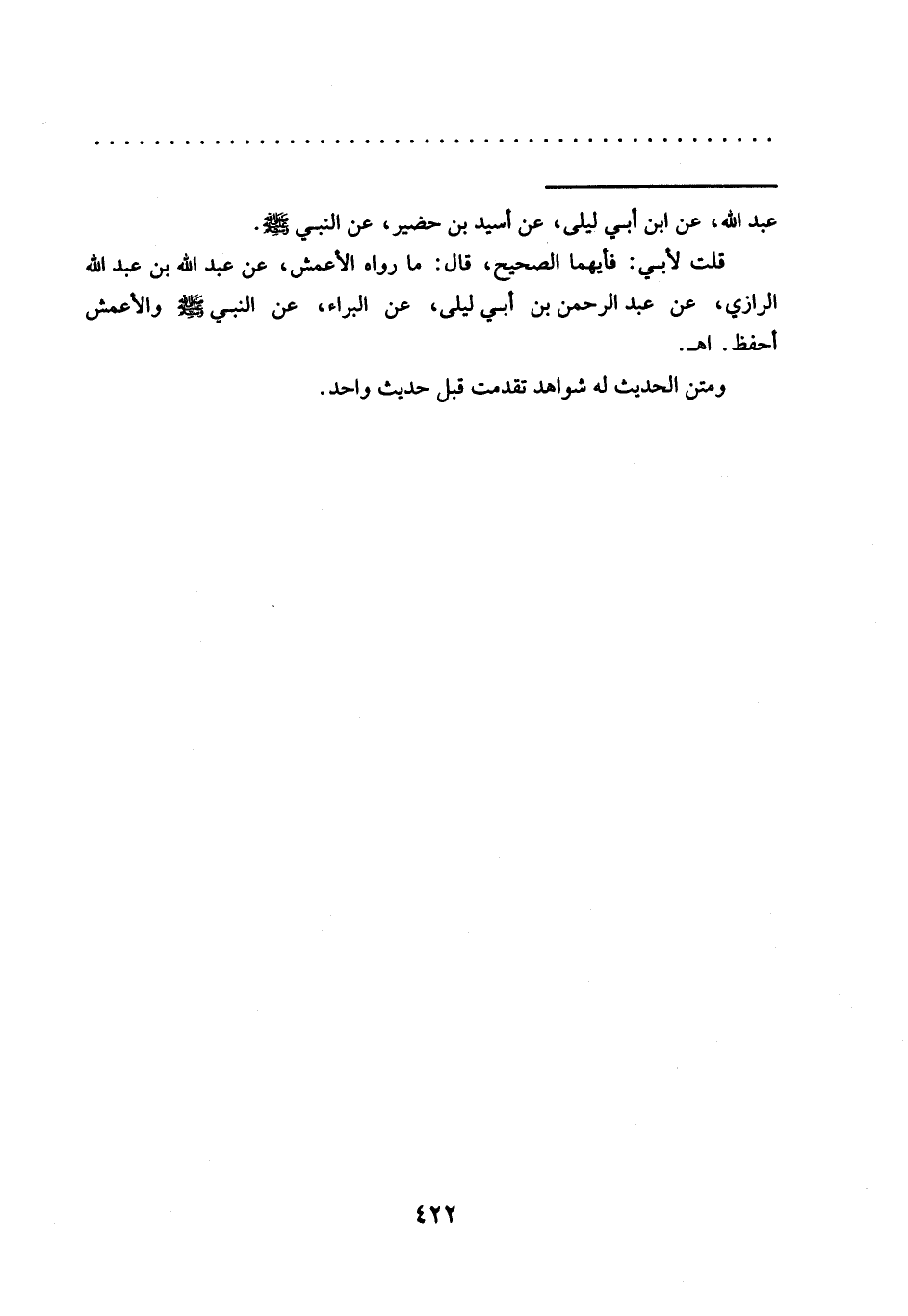 عَبْدِ اللَّهِ، عَنِ ابْنِ أَبِي لَيْلَى، عَنِ أسيد بن حضير، عن النبي - صلى الله عليه وسلم -.