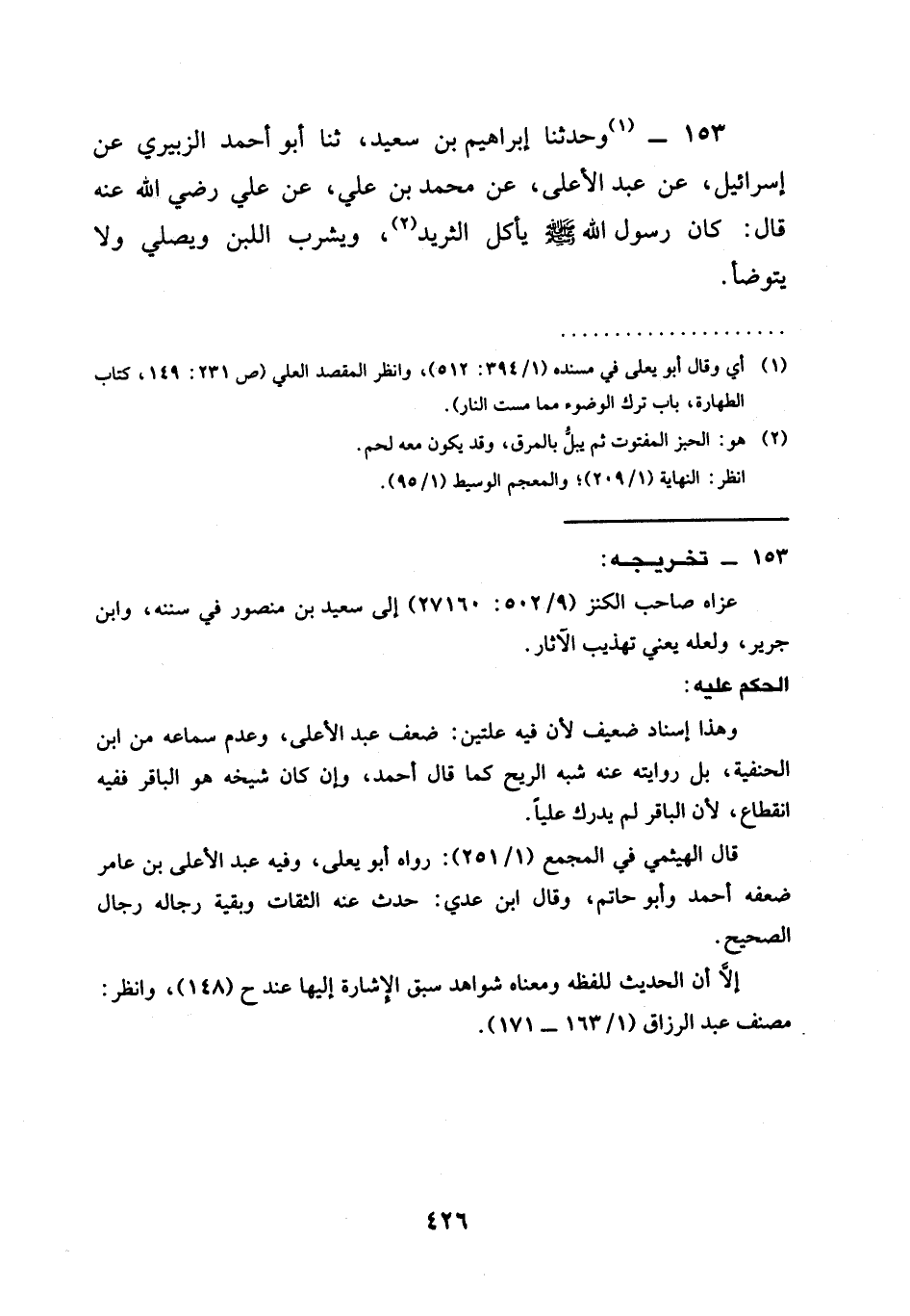 153 - وحَدَّثَنَا إِبْرَاهِيمُ بْنُ سَعِيدٍ، ثنا أَبُو أَحْمَدَ الزُّبَيْرِيُّ عَنْ إِسْرَائِيلَ، عَنْ عَبْدِ الْأَعْلَى، عَنْ مُحَمَّدِ بْنِ عَلِيٍّ، عَنْ عَلِيٍّ رَضِيَ اللهُ عَنْهُ قَالَ: كَانَ رَسُولُ اللَّهِ صَلَّى اللَّهُ عَلَيْهِ وَسَلَّمَ §يَأْكُلُ الثَّرِيدَ، وَيَشْرَبُ اللَّبَنَ وَيُصَلِّي وَلَا يَتَوَضَّأُ