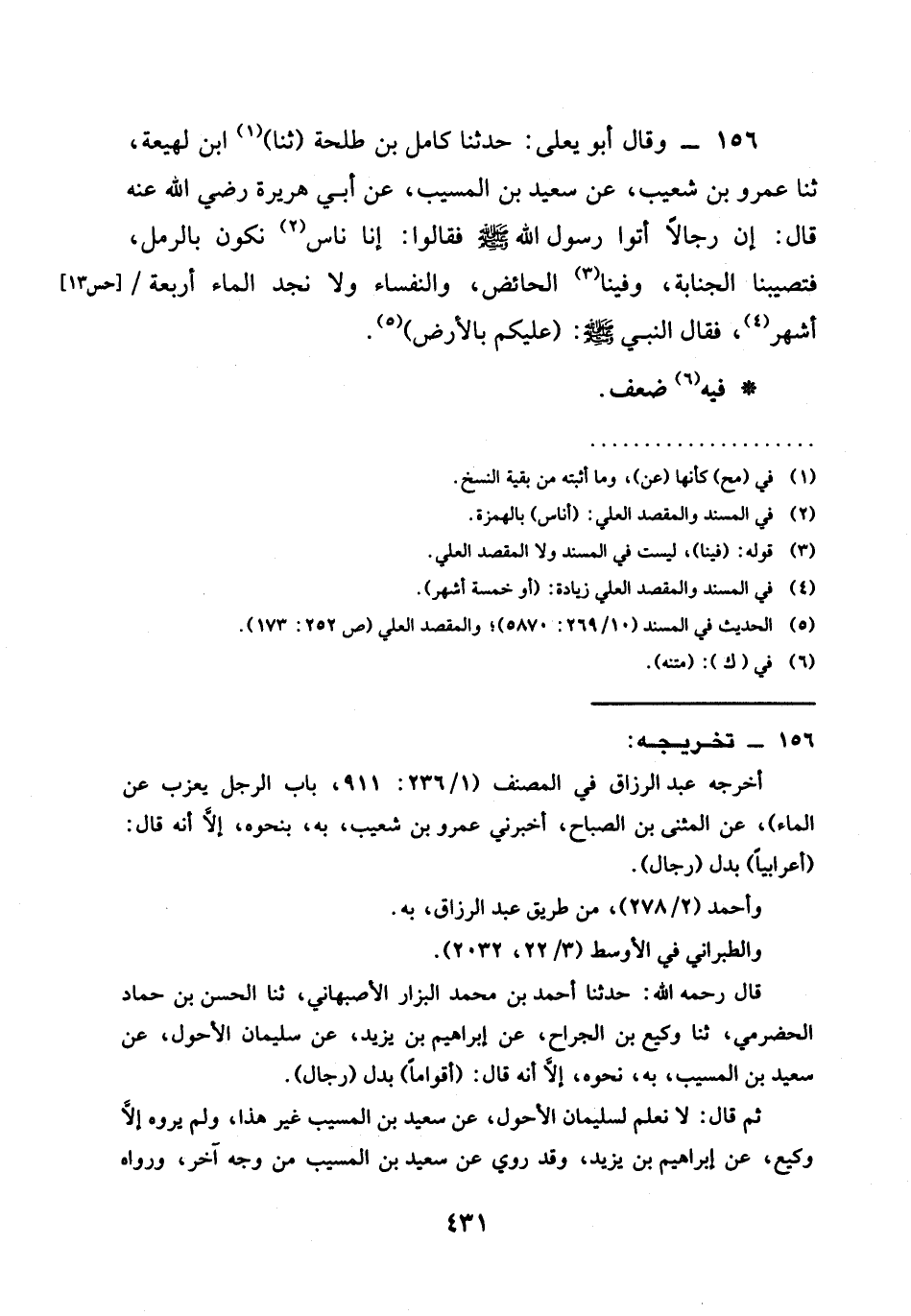 حَدَّثَنَا كَامِلُ بْنُ طَلْحَةَ (ثنا) ابْنُ لَهِيعَةَ، ثنا عَمْرُو بْنُ شُعَيْبٍ، عَنْ سَعِيدِ بْنِ الْمُسَيِّبِ، عَنْ أَبِي هُرَيْرَةَ رَضِيَ اللهُ عَنْهُ قال إِنَّ رِجَالًا أَتَوْا رَسُولَ اللَّهِ صَلَّى اللَّهُ عَلَيْهِ وَسَلَّمَ فَقَالُوا: إِنَّا §نَاسٌ نَكُونُ بالرمل أشهر، فَتُصِيبُنَا الْجَنَابَةُ، وَفِينَا الْحَائِضُ، وَالنُّفَسَاءُ وَلَا نَجْدُ الْمَاءَ أَرْبَعَةَ / أَشْهُرٍ، فَقَالَ النَّبِيُّ صَلَّى اللَّهُ عَلَيْهِ وَسَلَّمَ: (عَلَيْكُمْ بِالْأَرْضِ)