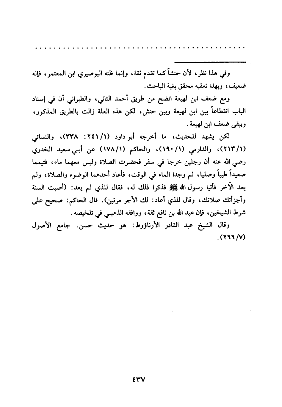 لكن يشهد للحديث، ما أخرجه أبو داود (1/ 241: 338)، والنسائي (1/ 213)، والدارمي (1/ 190)، والحاكم (1/ 178) عَنْ أَبِي سَعِيدٍ الْخُدْرِيِّ رَضِيَ اللَّهُ عَنْهُ أن رجلين خرجا في سفر فحضرت الصلاة وليس معهما ماء، فتيمما صعيدًا طيبًا وصليا، ثم وجدا الماء في الوقت، فأعاد أحدهما الوضوء والصلاة، ولم يعد الآخر فأتيا رسول الله - صلى الله عليه وسلم - فذكرا ذلك له، فقال للذي لم يعد: (أصبت السنة وأجزأتك صلاتك، وقال للذي أعاد: لك الأجر مرتين). قال الحاكم: صحيح على شرط الشيخين، فإن عبد الله بن نافع ثقة، ووافقه الذهبي في تلخيصه.