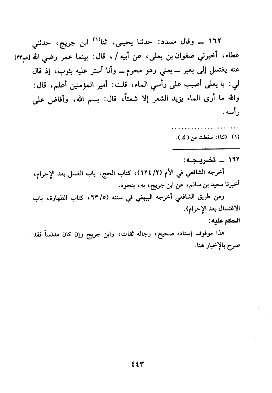حَدَّثَنَا يَحْيَى، ثنا ابْنُ جُرَيْجٍ، حَدَّثَنِي عَطَاءٌ، أَخْبَرَنِي صَفْوَانُ بْنُ يَعْلَى، عَنْ أَبِيهِ /، قَالَ: بَيْنَمَا عُمَرُ رَضِيَ اللهُ عَنْهُ يَغْتَسِلُ إِلَى بَعِيرٍ - يَعْنِي وَهُوَ مُحْرِمٌ - وَأَنَا أَسْتُرُ عَلَيْهِ بِثَوْبٍ، إِذْ قَالَ لِي: يَا يَعْلَى اصْبُبْ عَلَى رَأْسِي الْمَاءَ، قُلْتُ: أَمِيرُ الْمُؤْمِنِينَ أَعْلَمُ، قَالَ: وَاللَّهِ §مَا أَرَى الْمَاءَ يَزِيدُ الشَّعْرَ إِلَّا شَعَثًا، قَالَ: بِسْمِ اللَّهِ، وَأَفَاضَ عَلَى رَأْسِهِ