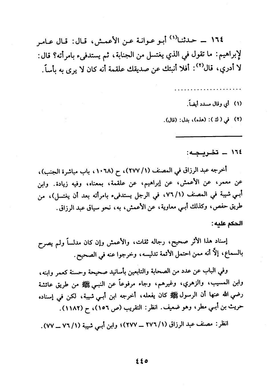 164 - حَدَّثَنَا أَبُو عَوَانَةَ عَنِ الْأَعْمَشِ، قَالَ: قَالَ عَامِرٌ لِإِبْرَاهِيمَ: مَا تَقُولُ فِي الَّذِي §يَغْتَسِلُ مِنَ الْجَنَابَةِ، ثُمَّ يَسْتَدْفِئُ بِامْرَأَتِهِ؟ قَالَ: لَا أَدْرِي، قَالَ: أَفَلَا أُنَبِّئُكَ عَنْ صَدِيقِكَ عَلْقَمَةَ أَنَّهُ كَانَ يَرَى بِهِ بَأْسًا -[446]-