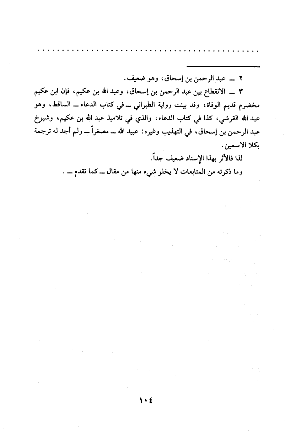 3 - الانقطاع بين عبد الرحمن بن إسحاق، وعبد الله بن عكيم، فإن ابن عكيم مخضرم قديم الوفاة، وقد بينت رواية الطبراني -في كتاب الدعاء- الساقط، وهو عبد الله القرشي، كذا في كتاب الدعاء، والذي في تلاميذ عبد الله بن عكيم، وشيوخ عبد الرحمن بن إسحاق، في التهذيب وغيره: عبيد الله -مصغرًا- ولم أجد له ترجمة بكلا الاسمين.