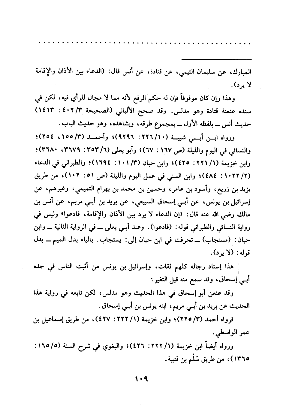ورواه ابن أبي شيبة (10/ 226: 9296)؛ وأحمد (3/ 155، 254)؛ والنسائي في اليوم والليلة (ص 167: 67)؛ وأبو يعلى (6/ 353: 3679، 3680)؛ وابن خزيمة (1/ 221: 425)؛ وابن حبان (3/ 101: 1694)؛ والطبراني في الدعاء (2/ 1022: 484)؛ وابن السني في عمل اليوم والليلة (ص 51: 102)، من طريق يزيد بن زريع، وأسود بن عامر، وحسين بن محمد بن بهرام التميمي، وغيرهم، عن إسرائيل بن يونس، عن أبي إسحاق السبيعي، عن بريد بن أبي مريم، عَنْ أَنَسِ بْنِ مَالِكٍ رَضِيَ اللَّهُ عَنْهُ قال: "إن الدعاء لا يرد بين الأذان والإقامة، فادعوا" وليس في رواية النسائي والطبراني قوله: (فادعوا). وعد أبي يعلى -في الرواية الثانية- وابن حبان: (مستجاب) -تحرفت في ابن حبان إلى: يستجاب. بالياء بدل الميم- بدل قوله: (لا يرد).