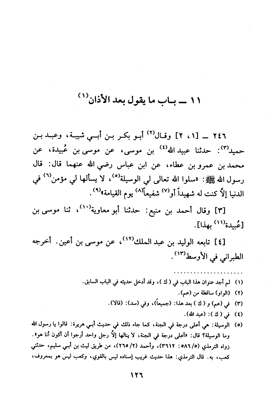 246 -[1، 2] وَقَالَ أَبُو بَكْرِ بْنُ أَبِي شَيْبَةَ وَعَبْدُ بْنُ حُمَيْدٍ حَدَّثَنَا عُبَيْدُ اللَّهِ بْنُ مُوسَى عَنْ مُوسَى بْنِ عُبَيْدَةَ عَنْ مُحَمَّدِ بْنِ عَمْرِو بْنِ عَطَاءٍ عَنِ ابْنِ عَبَّاسٍ رَضِيَ اللَّهُ عَنْهُما قَالَ قَالَ رَسُولُ اللَّهِ صَلَّى اللَّهُ عَلَيْهِ وَسَلَّمَ " §سَلُوا اللَّهَ تَعَالَى لِيَ الْوَسِيلَةَ لَا يَسْأَلُهَا لِي مُؤْمِنٌ فِي الدُّنْيَا إِلَّا كُنْتُ لَهُ شَهِيدًا أَوْ شَفِيعًا يَوْمَ الْقِيَامَةِ "