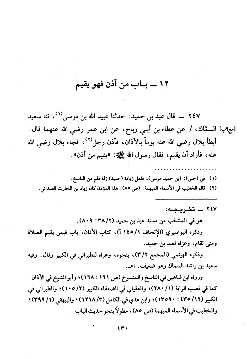 247 - قَالَ عَبْدُ بْنُ حُمَيْدٍ حَدَّثَنَا عُبَيْدُ اللَّهِ بْنُ مُوسَى ثنا سَعِيدٌ السَّمَّاكُ عَنْ عَطَاءِ بْنِ أَبِي رَبَاحٍ عَنِ ابْنِ عُمَرَ رَضِيَ اللَّهُ عَنْهُما قَالَ أَبْطَأَ بِلَالٌ رَضِيَ اللَّهُ عَنْهُ يَوْمًا بِالْأَذَانِ فَأَذَّنَ رَجُلٌ فَجَاءَ بِلَالٌ رَضِيَ اللَّهُ عَنْهُ فَأَرَادَ أَنْ يُقِيمَ فَقَالَ رَسُولُ اللَّهِ صَلَّى اللَّهُ عَلَيْهِ وَسَلَّمَ " §يُقِيمُ مَنْ أَذَّنَ "