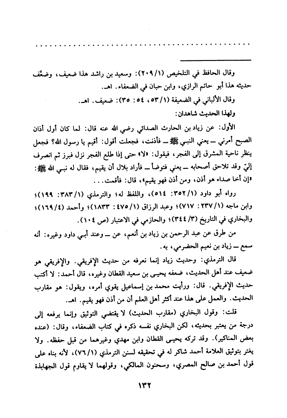 قال الترمذي: وحديث زياد إنما نعرفه من حديث الإفريقي. والإفريقي هو ضعيف عند أهل الحديث، ضعفه يحيى بن سعيد القطان وغيره، قال أحمد: لا أكتب حديث الإفريقي. قال: ورأيت محمد بن إسماعيل يقوي أمره، ويقول: هو مقارب الحديث. والعمل على هذا عند أكثر أهل العلم أن من أذن فهو يقيم. اهـ.