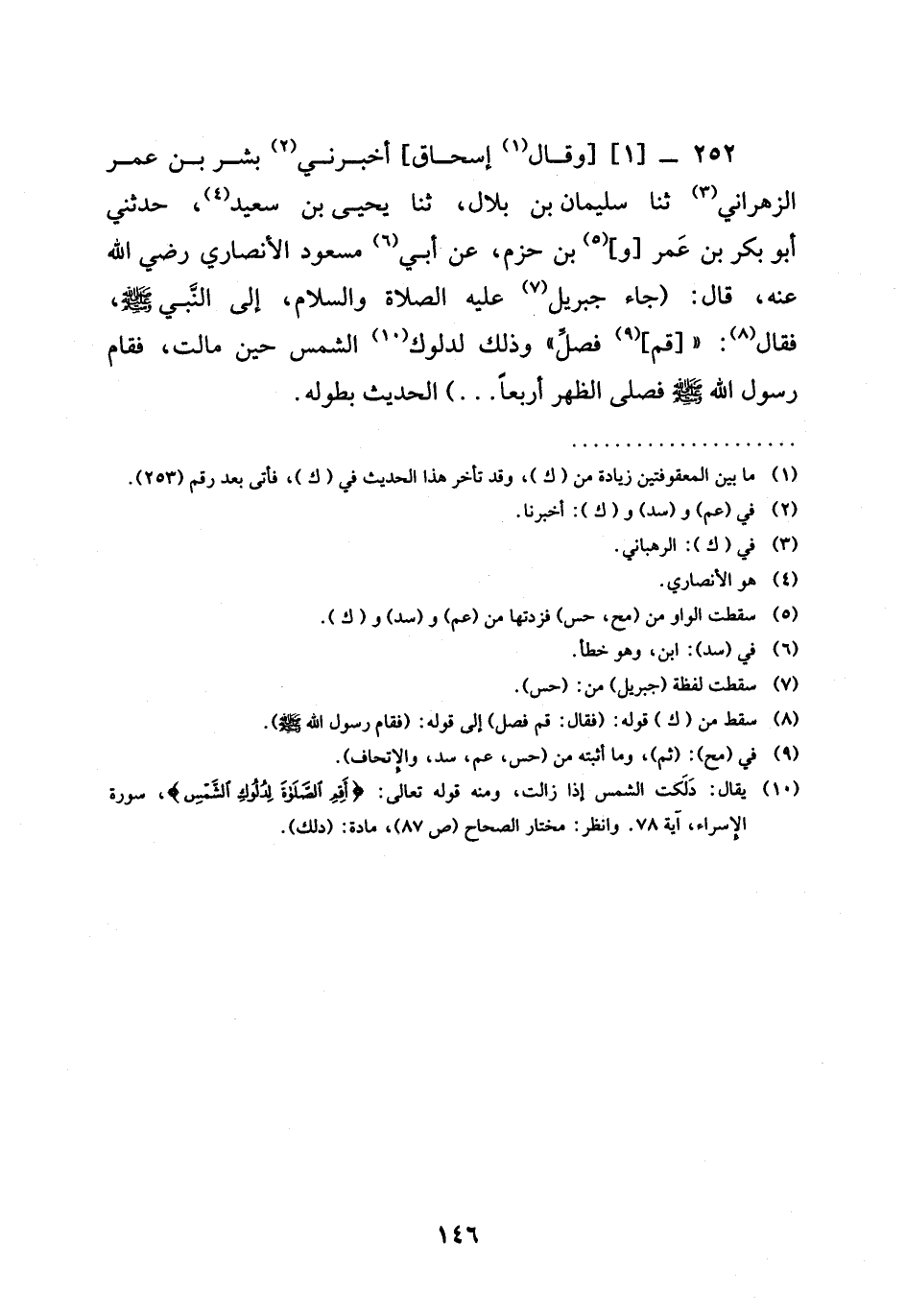 252 -[1] وَقَالَ إِسْحَاقُ أَخْبَرَني بِشْرُ بْنُ عُمَرَ الزَّهْرَانِيُّ ثنا سُلَيْمَانُ بْنُ بِلَالٍ ثنا يَحْيَى بْنُ سَعِيدٍ حَدَّثَنِي أَبُو بَكْرِ بْنُ عَمْرِو بْنِ حَزْمٍ عَنْ أَبِي مسعود الأنصاري رضي الله عنه قَالَ (جَاءَ جِبْرِيلُ عليه الصلاة والسلام إِلَى النَّبِيِّ صَلَّى اللَّهُ عَلَيْهِ وَسَلَّمَ فَقَالَ §قُمْ فَصَلِّ وذَلِكَ لِدُلُوكِ الشَّمْسِ حِينَ مَالَتْ فَقَامَ رَسُولُ اللَّهِ صَلَّى اللَّهُ عَلَيْهِ وَسَلَّمَ فَصَلَّى الظُّهْرَ أَرْبَعًا) الْحَدِيثَ بِطُولِهِ -[147]-