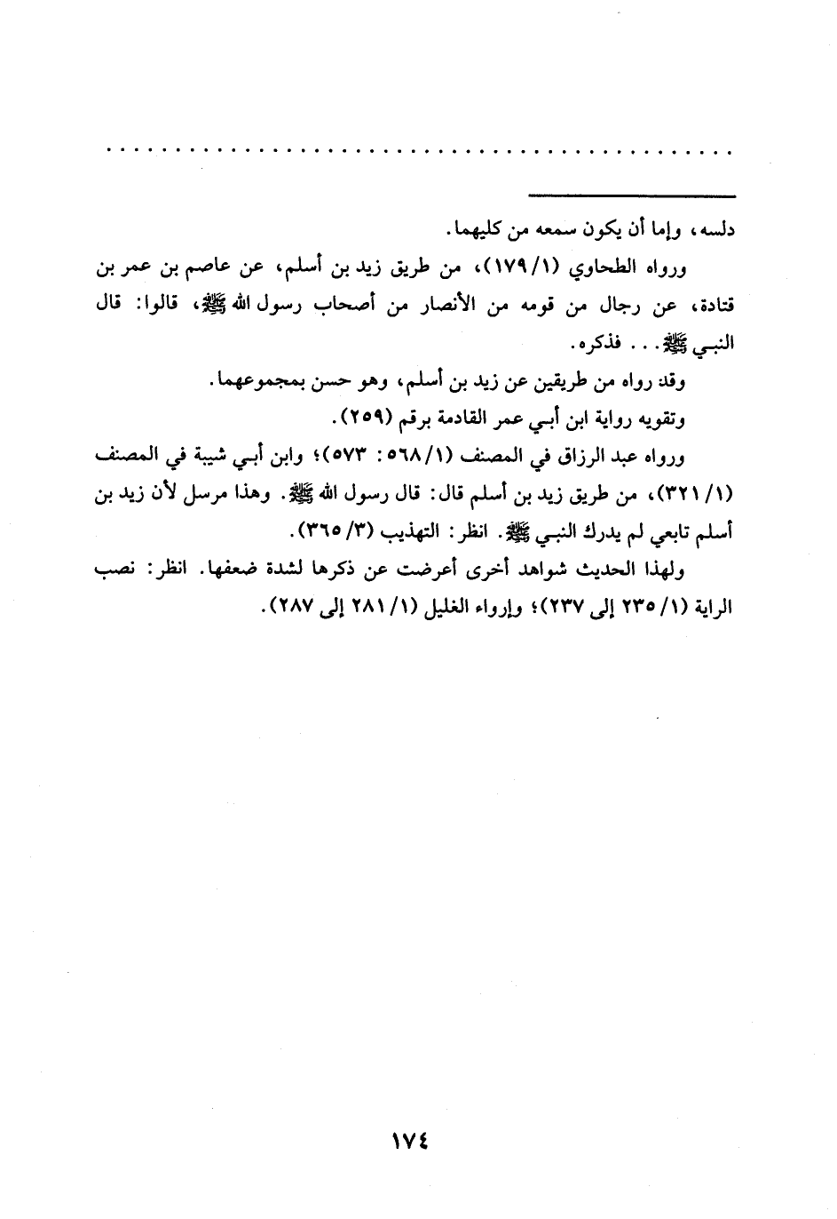 ورواه عبد الرزاق في المصنف (1/ 568: 573)؛ وابن أبي شيبة في المصنف (1/ 321)، من طريق زيد بن أسلم قَالَ: قَالَ رَسُولُ اللَّهِ - صَلَّى اللَّهُ عَلَيْهِ وسلم -. وهذا مرسل لأن زيد بن أسلم تابعي لم يدرك النبي - صلى الله عليه وسلم -. انظر: التهذيب (3/ 365).