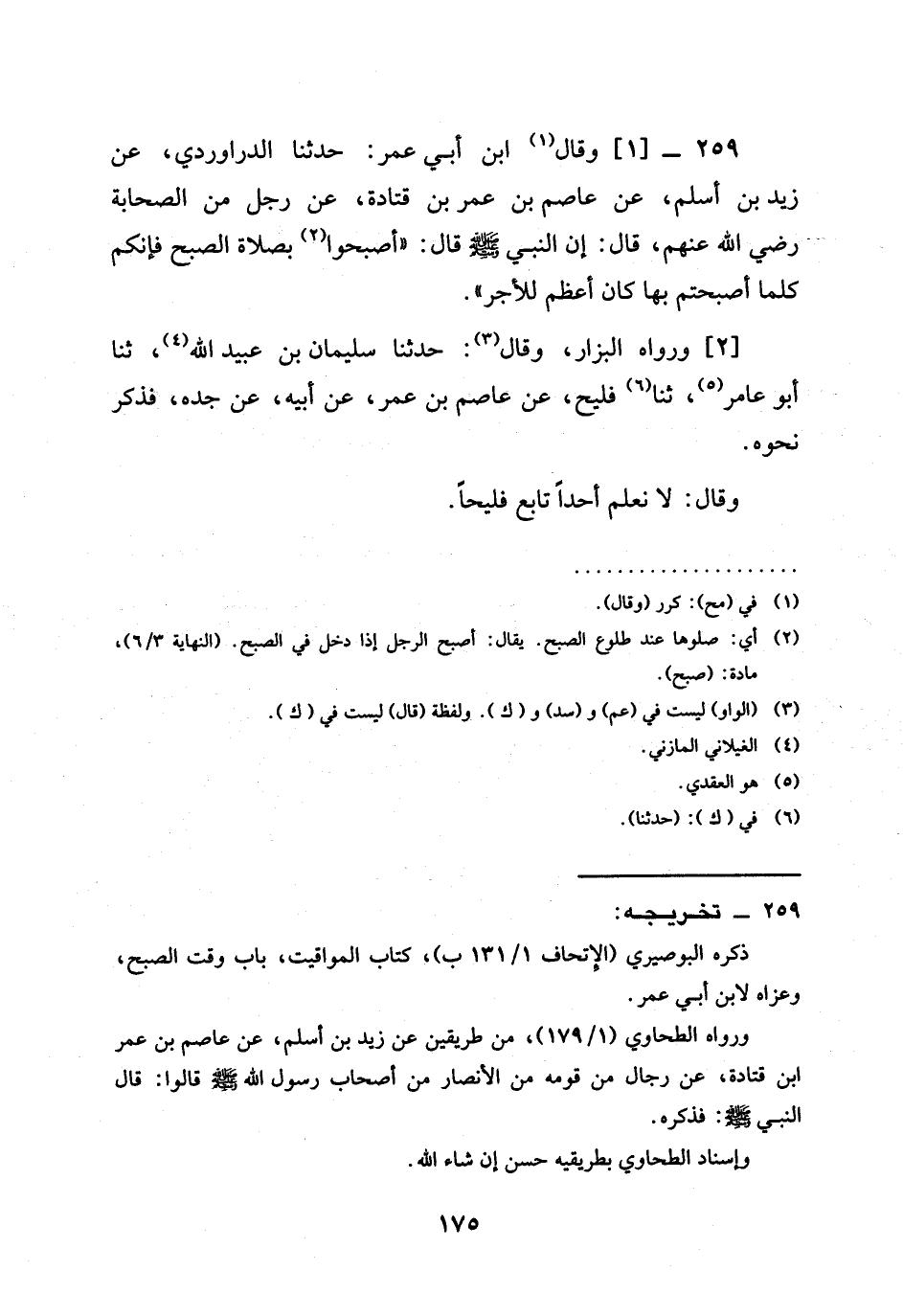 295 -[1] وَقَالَ ابْنُ أَبِي عُمَرَ حَدَّثَنَا الدَّرَاوَرْدِيُّ عَنْ زَيْدِ بْنِ أَسْلَمَ عَنْ عَاصِمِ بْنِ عُمَرَ بْنِ قَتَادَةَ عَنْ رَجُلٍ مِنَ الصَّحَابَةِ رَضِيَ اللَّهُ عَنْهُم قال إنَّ النَّبِيَّ صَلَّى اللَّهُ عَلَيْهِ وَسَلَّمَ قَالَ §أَصْبِحُوا بِصَلَاةِ الصُّبْحِ فَإِنَّكُمْ كُلَّمَا أَصْبَحْتُمْ بِهَا كَانَ أَعْظَمَ لِلْأَجْرِ