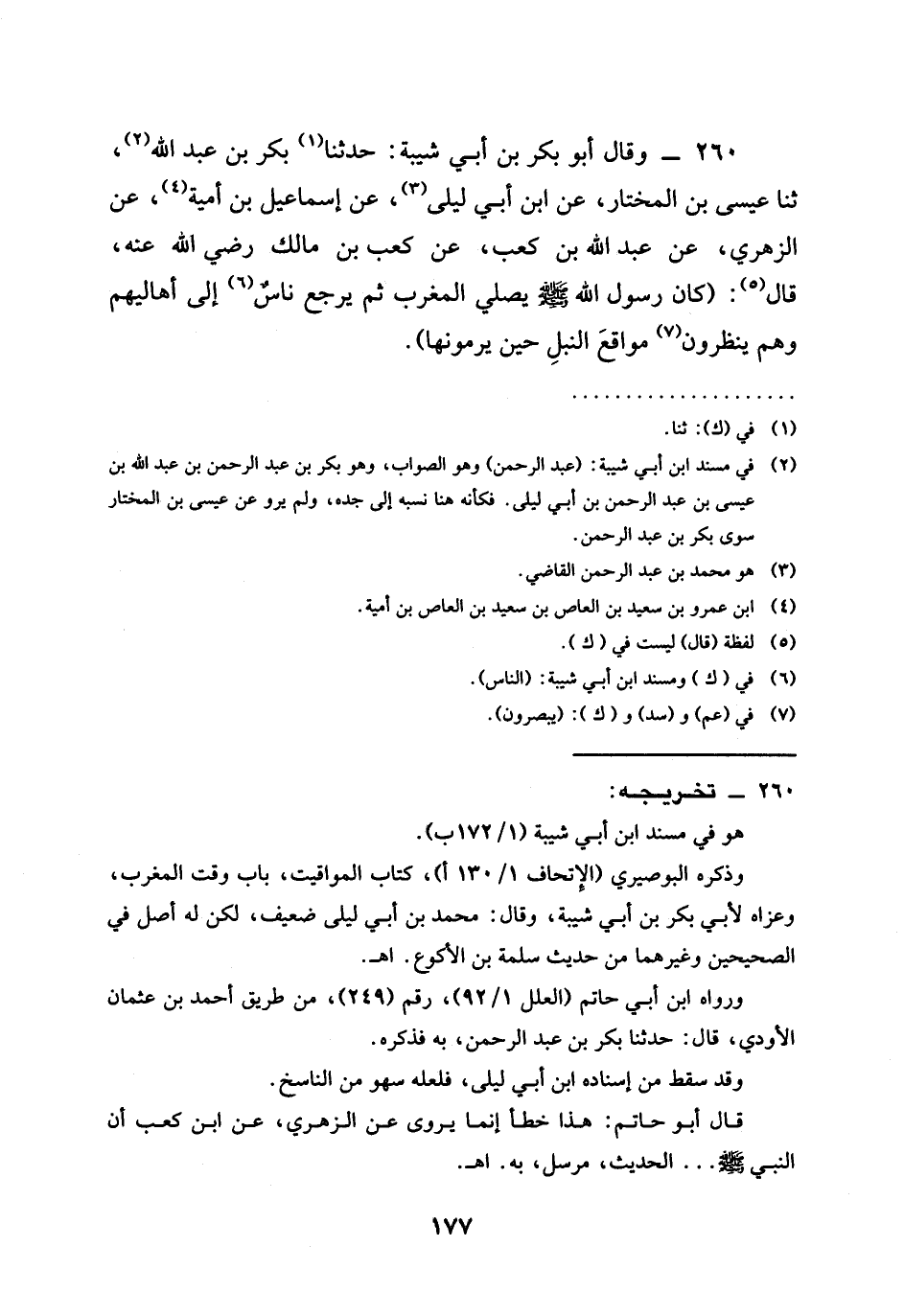 260 - وَقَالَ أَبُو بَكْرِ بْنُ أَبِي شَيْبَةَ حَدَّثَنَا بَكْرُ بن عبد الله ثنا عِيسَى بْنُ الْمُخْتَارِ عَنِ ابْنِ أَبِي لَيْلَى عَنْ إِسْمَاعِيلَ بْنِ أُمَيَّةَ عَنِ الزُّهْرِيِّ عَنْ عَبْدِ اللَّهِ بْنِ كَعْبٍ عَنْ كَعْبِ بْنِ مَالِكٍ رَضِيَ اللَّهُ عَنْهُ قَالَ (كَانَ رَسُولُ اللَّهِ صَلَّى اللَّهُ عَلَيْهِ وَسَلَّمَ §يُصَلِّي الْمَغْرِبَ ثُمَّ يَرْجِعُ نَاسٌ إِلَى أهليهم وَهُمْ يَنْظُرُونَ مَوَاقِعَ النَّبْلِ حِينَ يَرْمُونَهَا