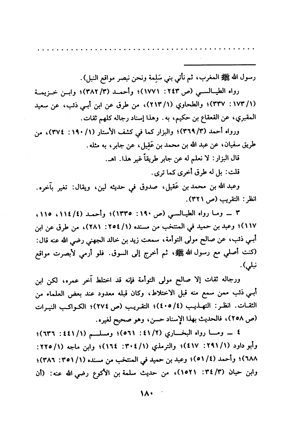 3 - وما رواه الطيالسي (ص 190: 1335)؛ وأحمد (4/ 114، 115، 117)؛ وعبد بن حميد في المنتخب من مسنده (1/ 254: 281)، من طرق عن ابْنُ أَبِي ذِئْبٍ، عَنْ صَالِحٍ مَوْلَى التَّوْأَمَةِ، سمعت زَيْدِ بْنِ خَالِدٍ الْجُهَنِيِّ رَضِيَ اللهُ عَنْهُ قال: (كنت أصلي مَعَ رَسُولِ اللَّهِ - صَلَّى اللَّهُ عَلَيْهِ وَسَلَّمَ -، ثم أخرج إلى السوق. فلو أرمي لأبصرت مواقع نبلي).