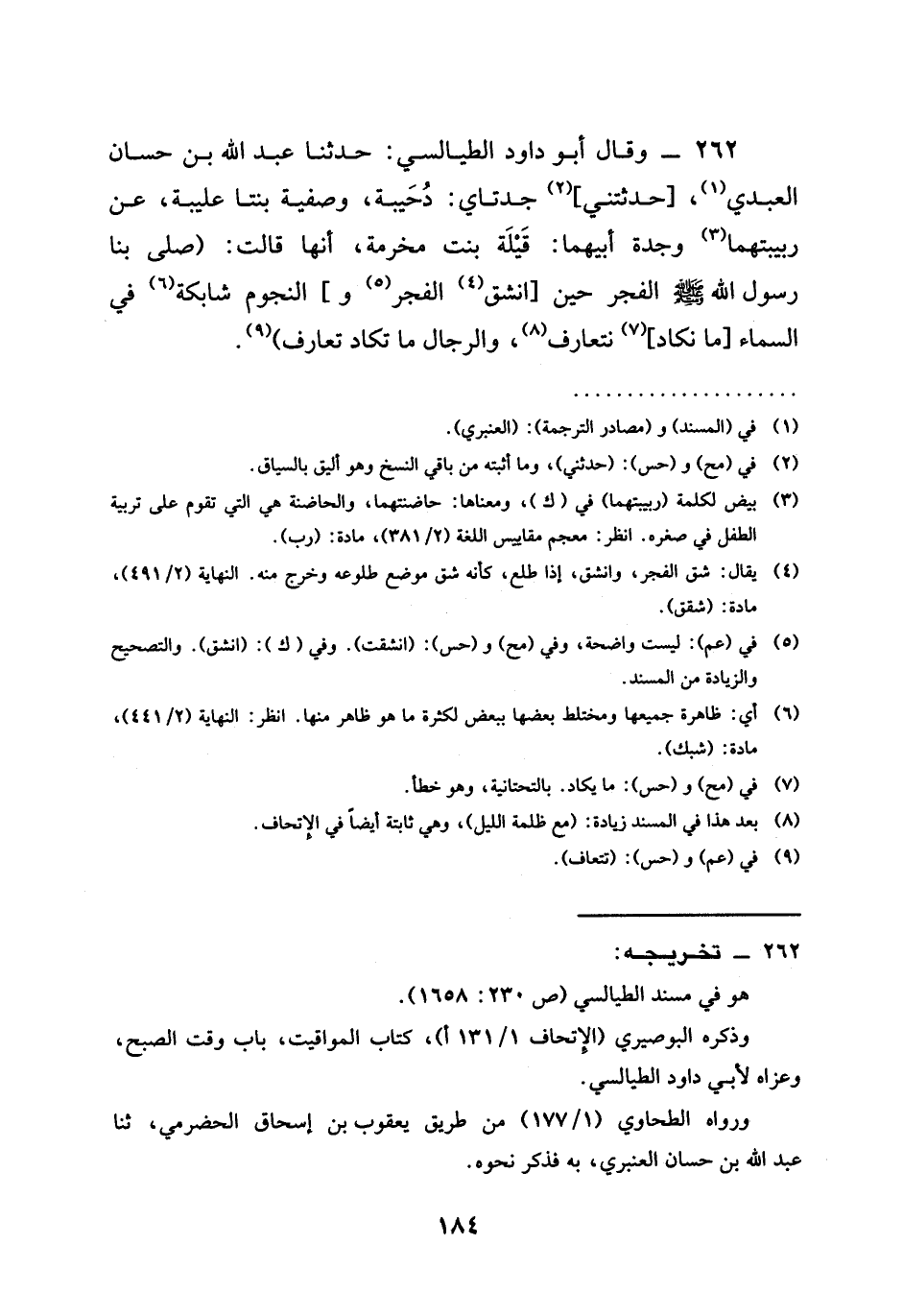 262 - وَقَالَ أَبُو دَاوُدَ الطَّيَالِسِيُّ حَدَّثَنَا عَبْدُ اللَّهِ بْنُ حَسَّانَ العبدي حَدَّثَتْنِي جَدَّتَايَ دُحَيْبَةُ وَصَفِيَّةُ بِنْتَا عُلَيْبَةَ عَنْ رَبِيبَتِهِمَا وَجَدَّةِ أَبِيهِمَا قَيْلَةَ بِنْتِ مَخْرَمَةَ أَنَّهَا قَالَتْ (§صَلَّى بِنَا رَسُولُ اللَّهِ صَلَّى اللَّهُ عَلَيْهِ وَسَلَّمَ الْفَجْرَ حِينَ انْشَقَّ الْفَجْرُ وَالنُّجُومُ شَابِكَةً فِي السَّمَاءِ مَا نَكَادُ نَتَعَارَفُ وَالرِّجَالُ مَا تَكَادُ تَعَارَفُ)