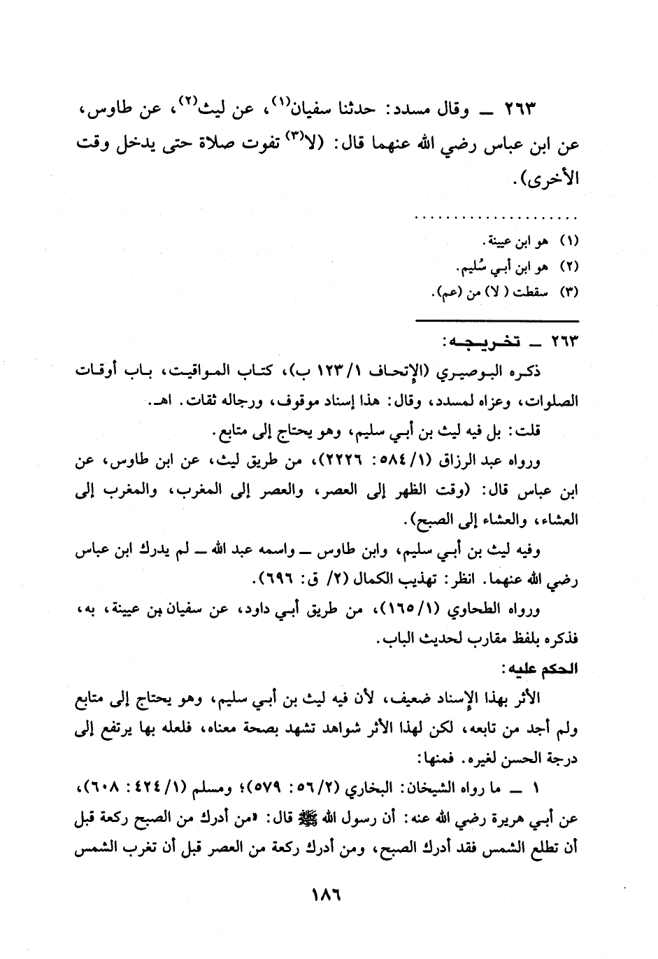 263 - وَقَالَ مُسَدَّدٌ حَدَّثَنَا سُفْيَانُ عَنْ لَيْثٍ عَنْ طَاوُسٍ عَنِ ابْنِ عَبَّاسٍ رَضِيَ اللَّهُ عَنْهُما قَالَ (§لَا تَفُوتُ صَلَاةٌ حَتَّى يَدْخُلَ وَقْتُ الْأُخْرَى)