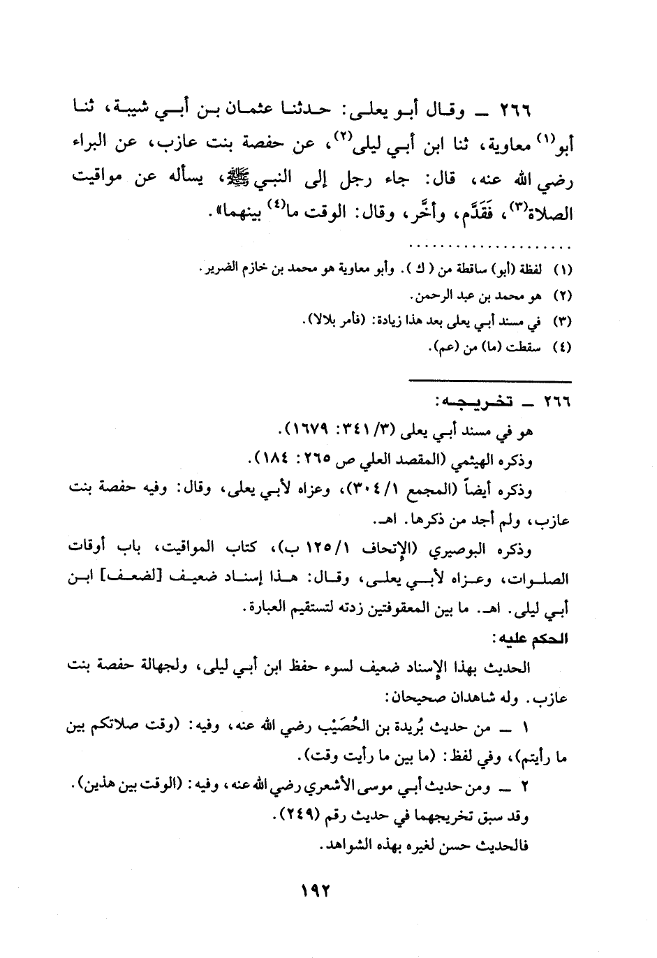 266 - وَقَالَ أَبُو يَعْلَى حَدَّثَنَا عُثْمَانُ بْنُ أَبِي شَيْبَةَ ثنا أَبُو مُعَاوِيَةَ ثنا ابْنُ أَبِي لَيْلَى عَنْ حَفْصَةَ بِنْتِ عَازِبٍ عَنِ الْبَرَاءِ رَضِيَ اللَّهُ عَنْهُ قَالَ جَاءَ رَجُلٌ إِلَى النَّبِيِّ صَلَّى اللَّهُ عَلَيْهِ وَسَلَّمَ §يَسْأَلُهُ عَنْ مَوَاقِيتِ الصَّلَاةِ فَقَدَّمَ وَأَخَّرَ وَقَالَ الْوَقْتُ مَا بَيْنَهُمَا "