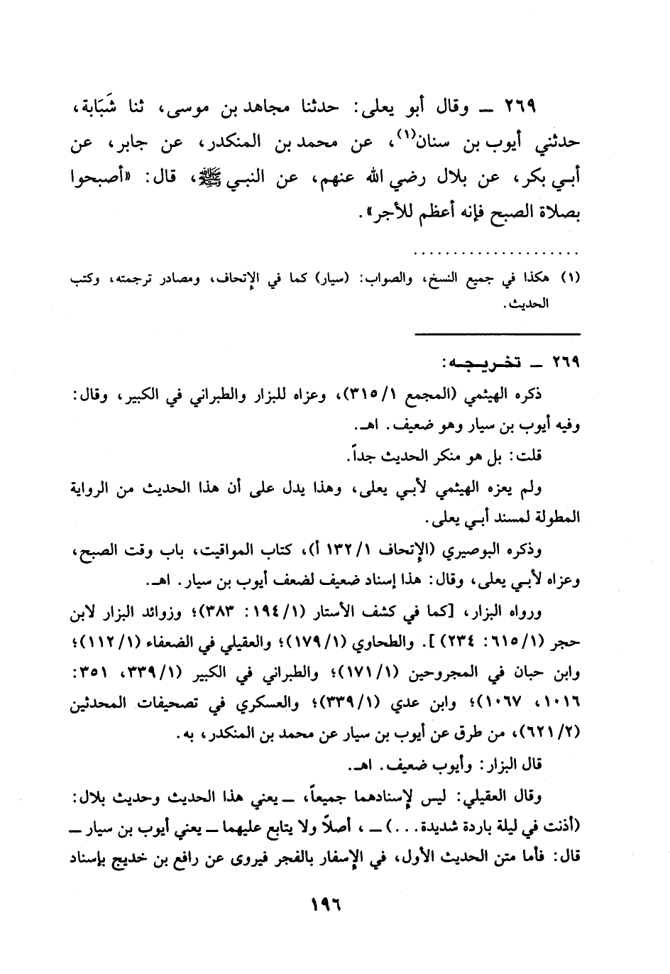 269 - وَقَالَ أَبُو يَعْلَى حَدَّثَنَا مُجَاهِدُ بْنُ مُوسَى ثنا شَبَابَةُ حَدَّثَنِي أَيُّوبُ بْنُ سِنَانٍ عَنْ مُحَمَّدِ بْنِ الْمُنْكَدِرِ عَنْ جَابِرٍ عَنْ أَبِي بَكْرٍ عَنْ بِلَالٍ رَضِيَ اللَّهُ عَنْهُمْ عَنِ النَّبِيِّ صَلَّى اللَّهُ عَلَيْهِ وَسَلَّمَ قَالَ §أَصْبِحُوا بِصَلَاةِ الصُّبْحِ فَإِنَّهُ أَعْظَمُ لِلْأَجْرِ