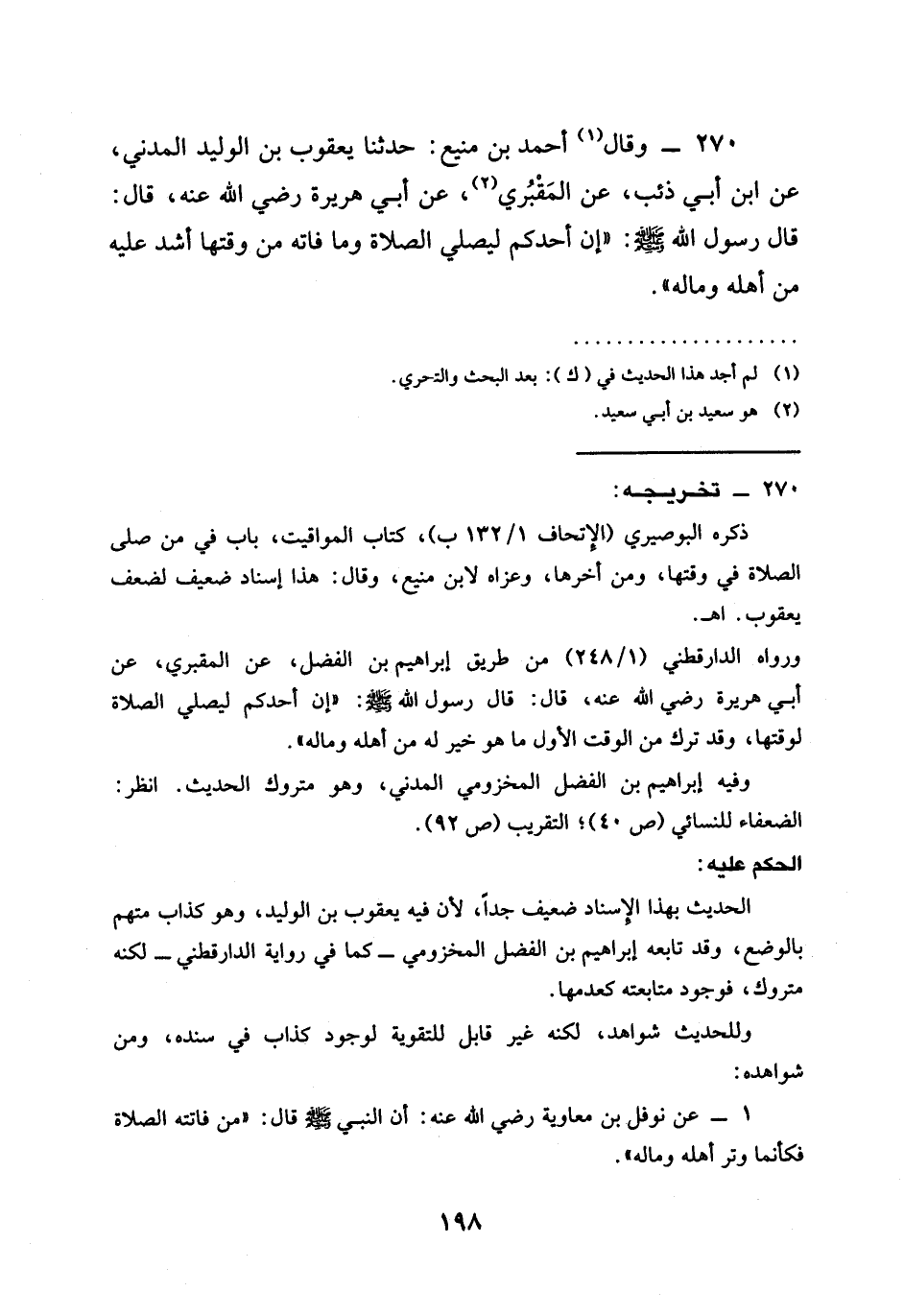 270 - وَقَالَ أَحْمَدُ بْنُ مَنِيعٍ حَدَّثَنَا يَعْقُوبُ بْنُ الْوَلِيدِ الْمَدَنِيُّ عَنِ ابْنِ أَبِي ذِئْبٍ عَنِ الْمَقْبُرِيِّ عَنْ أَبِي هُرَيْرَةَ رَضِيَ اللَّهُ عَنْهُ قَالَ قَالَ رَسُولُ اللَّهِ صَلَّى اللَّهُ عَلَيْهِ وَسَلَّمَ " إِنَّ §أَحَدَكُمْ لِيُصَلِّي الصَّلَاةَ وَمَا فَاتَهُ مِنْ وَقْتِهَا أَشَدُّ عَلَيْهِ مِنْ أَهْلِهِ وَمَالِهِ "
