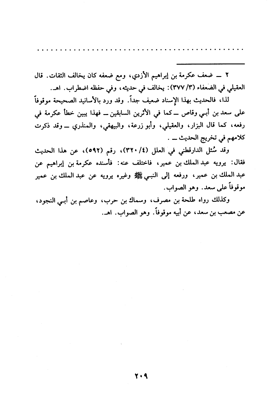 وقد سُئل الدارقطني في العلل (4/ 320)، رقم (592)، عن هذا الحديث فقال: يرويه عبد الملك بن عمير، فاختلف عنه: فأسنده عكرمة بن إبراهيم عن عبد الملك بن عمير، وَرَفَعَهُ إِلَى النَّبِيِّ - صَلَّى اللَّهُ عَلَيْهِ وَسَلَّمَ - وغيره يرويه عن عبد الملك بن عمير موقوفًا على سعد. وهو الصواب.