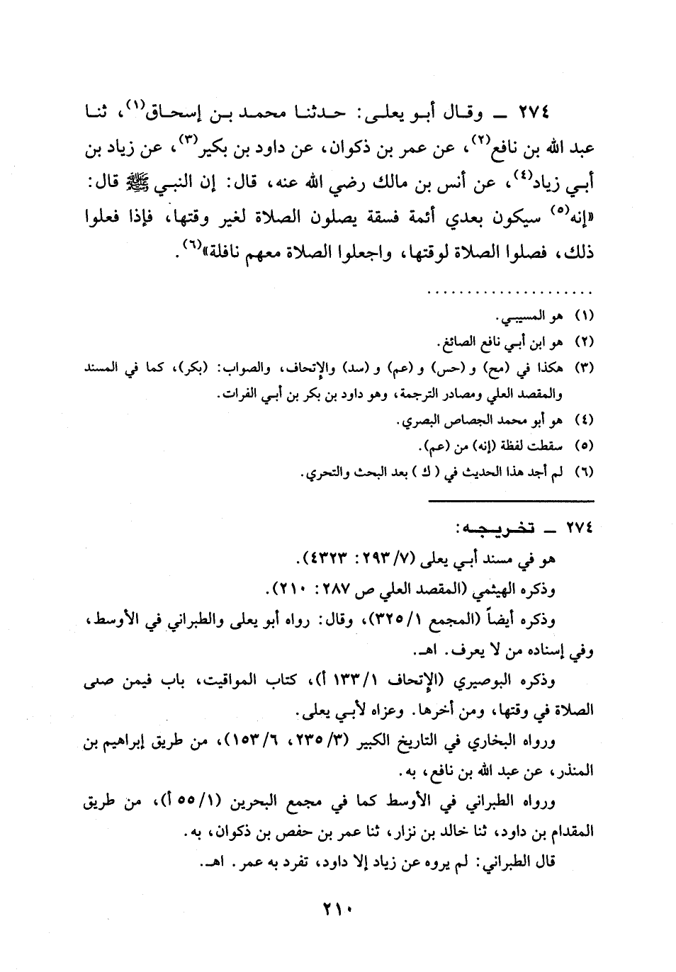 274 - وَقَالَ أَبُو يَعْلَى حَدَّثَنَا مُحَمَّدُ بْنُ إِسْحَاقَ ثنا عَبْدُ اللَّهِ بْنُ نَافِعٍ عَنْ عُمَرَ بْنِ ذَكْوَانَ عَنْ دَاوُدَ بْنِ بُكَيْرٍ عَنْ زِيَادِ بْنِ أَبِي زِيَادٍ عَنْ أَنَسِ بْنِ مَالِكٍ رَضِيَ اللَّهُ عَنْهُ قَالَ إِنَّ النَّبِيَّ صَلَّى اللَّهُ عَلَيْهِ وَسَلَّمَ قَالَ " §إِنَّهُ سَيَكُونُ بَعْدِي أَئِمَّةٌ فَسَقَةٌ يُصَلُّونَ الصَّلَاةَ لِغَيْرِ وَقْتِهَا فَإِذَا فَعَلُوا ذَلِكَ فَصَلُّوا الصَّلَاةَ لِوَقْتِهَا وَاجْعَلُوا الصَّلَاةَ مَعَهُمْ نَافِلَةً "
