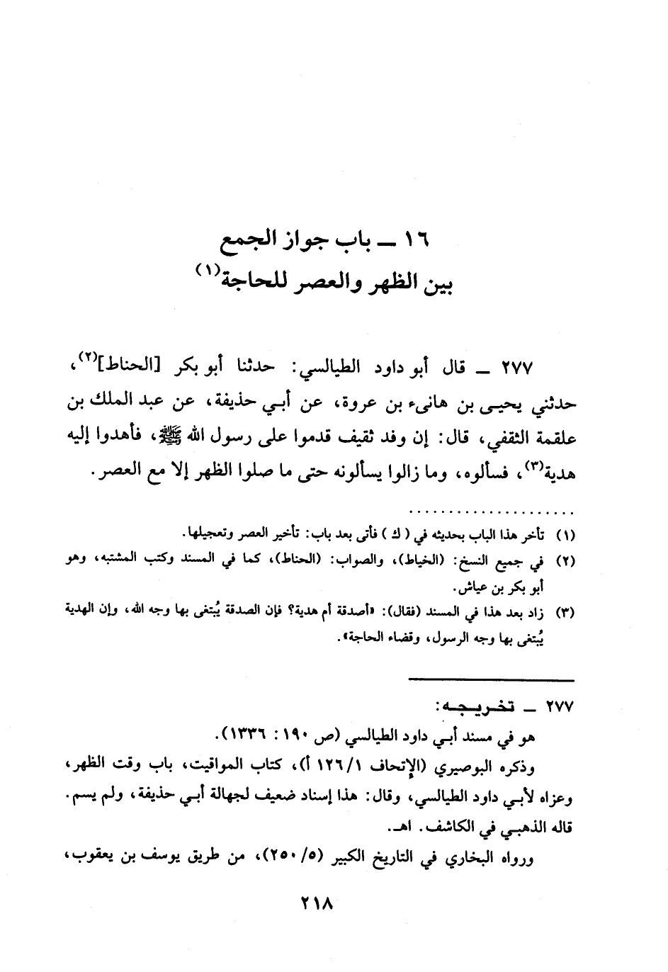 277 - قَالَ أَبُو دَاوُدَ الطَّيَالِسِيُّ حَدَّثَنَا أَبُو بَكْرٍ الْحَنَّاطُ حَدَّثَنِي يَحْيَى بْنُ هَانِئِ بْنِ عُرْوَةَ عَنْ أَبِي حُذَيْفَةَ عَنْ عَبْدِ الْمَلِكِ بْنِ عَلْقَمَةَ الثَّقَفِيِّ قَالَ إِنَّ وَفْدَ ثَقِيفٍ قَدِمُوا عَلَى رَسُولِ اللَّهِ صَلَّى اللَّهُ عَلَيْهِ وَسَلَّمَ فَأَهْدَوْا إِلَيْهِ هَدِيَّةً فَسَأَلُوهُ وَمَا زَالُوا يَسْأَلُونَهُ حَتَّى §مَا صَلَّوُا الظُّهْرَ إِلَّا مَعَ الْعَصْرِ