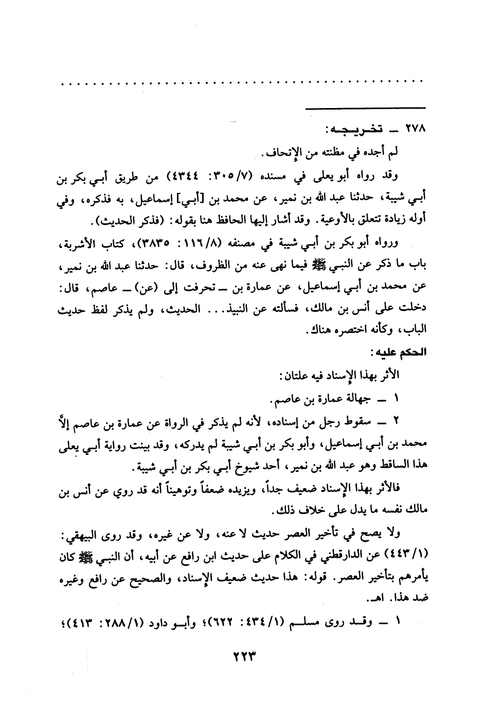 2 - سقوط رجل من إسناده، لأنه لم يذكر في الرواة عن عمارة بن عاصم إلَّا محمد بن أبي إسماعيل، وأبو بكر بن أبي شيبة لم يدركه، وقد بينت رواية أبي يعلى هذا الساقط وهو عبد الله بن نمير، أحد شيوخ أبي بكر بن أبي شيبة.