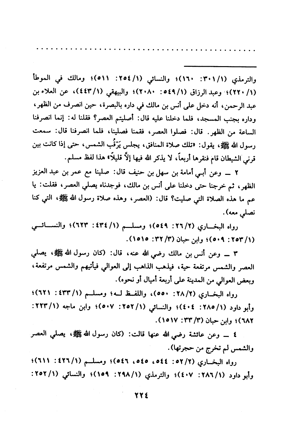 = والترمذي (1/ 301: 160)؛ والنسائي (1/ 254: 511)؛ ومالك في الموطأ (1/ 225)؟ وعبد الرزاق (1/ 549: 2080)؛ والبيهقي (1/ 443)، عن العلاء بن عبد الرحمن، أنه دخل على أنس بن مالك في داره بالبصرة، حين انصرف من الظهر، وداره بجنب المسجد، فلما دخلنا عليه قال: أصليتم العصر؟ فقلنا له؟ إنما انصرفنا الساعة من الظهر. قال: فصلوا العصر، فقمنا فصلينا، فلما انصرفنا قال: سمعت رسول الله - صلى الله عليه وسلم -، يقول: "تلك صلاة المنافق، يجلس يَرقُب الشمس، حتى إذا كانت بين قرني الشيطان قام فنقرها أربعًا، لا يذكر الله فيها إلَّا قليلًا" هذا لفظ مسلم.