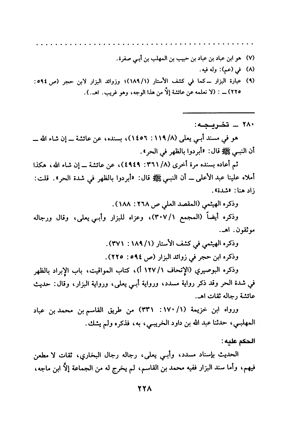 وذكره البوصيري (الإتحاف 1/ 127 أ)، كتاب المواقيت، باب الإبراد بالظهر في شدة الحر وقد ذكر رواية مسدد، ورواية أبي يعلى، ورواية البزار، وقال: حديث عائشة رجاله ثقات اهـ.